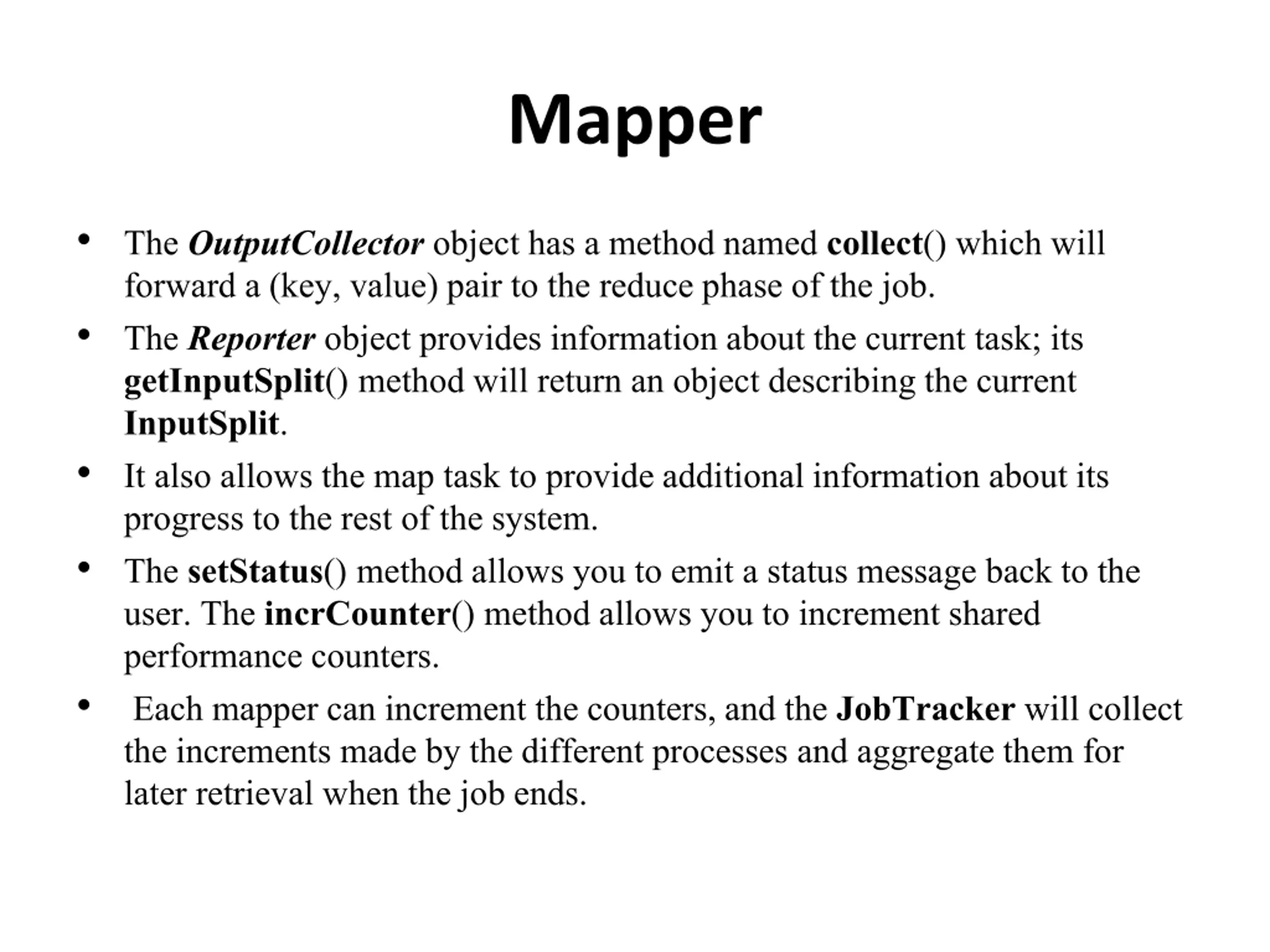 Mapper The OutputCollectorobject has a method named collect() which will forward a (key, value) pair to the reduce phase of the job. The Reporterobject provides information about the current task; its getInputSplit() method will return an object describing the current InputSplit. It also allows the map task to provide additional information about its progress to the rest of the system. The setStatus() method allows you to emit a status message back to the user. The incrCounter() method allows you to increment shared performance counters. Each mappercan increment the counters, and the JobTrackerwill collect the increments made by the different processes and aggregate them for later retrieval when the job ends.