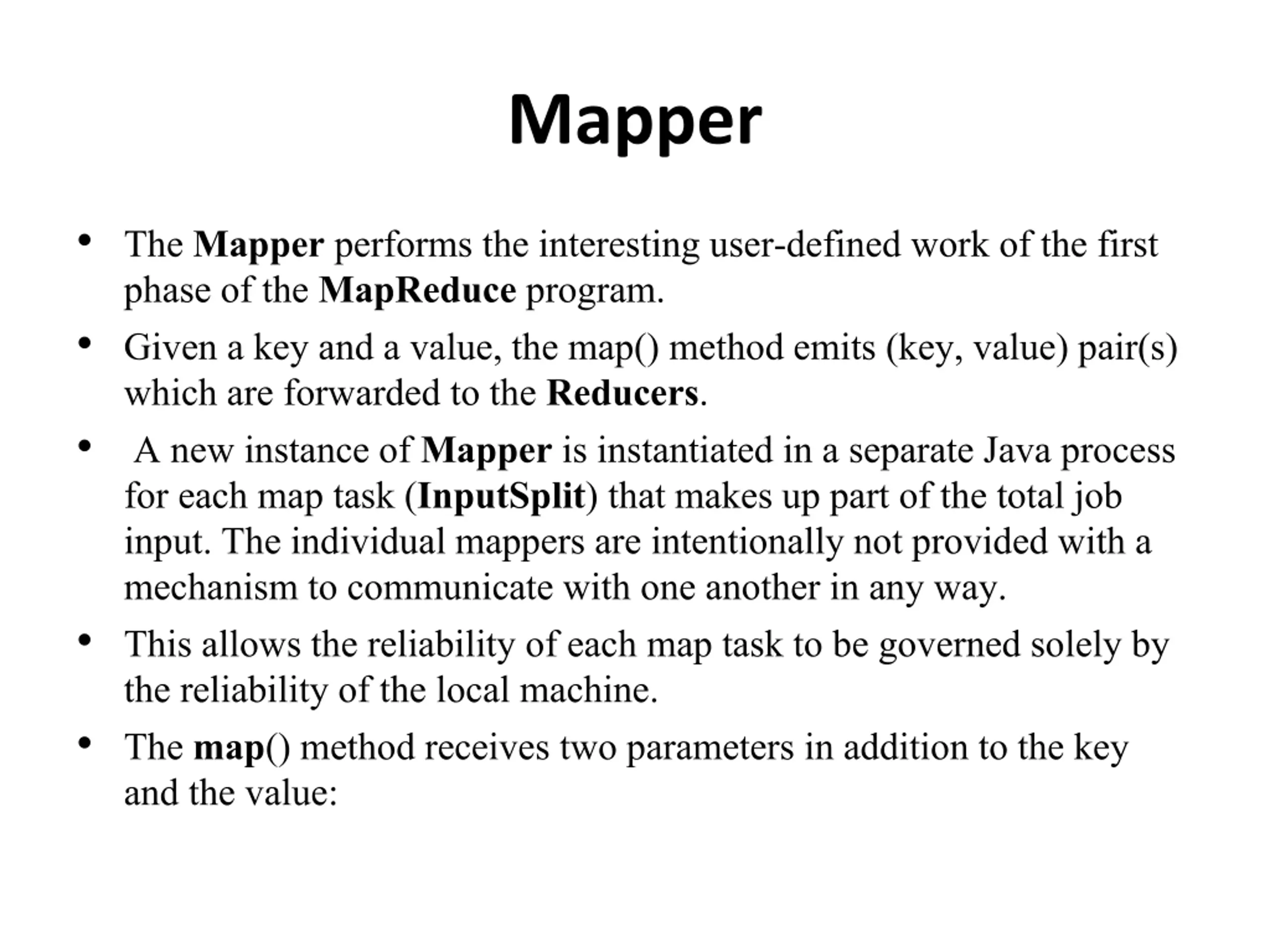 Mapper The Mapperperforms the interesting user-defined work of the first phase of the MapReduceprogram. Given a key and a value, the map() method emits (key, value) pair(s) which are forwarded to the Reducers. A new instance of Mapperis instantiated in a separate Java process for each map task (InputSplit) that makes up part of the total job input. The individual mappersare intentionally not provided with a mechanism to communicate with one another in any way. This allows the reliability of each map task to be governed solely by the reliability of the local machine. The map() method receives two parameters in addition to the key and the value:
