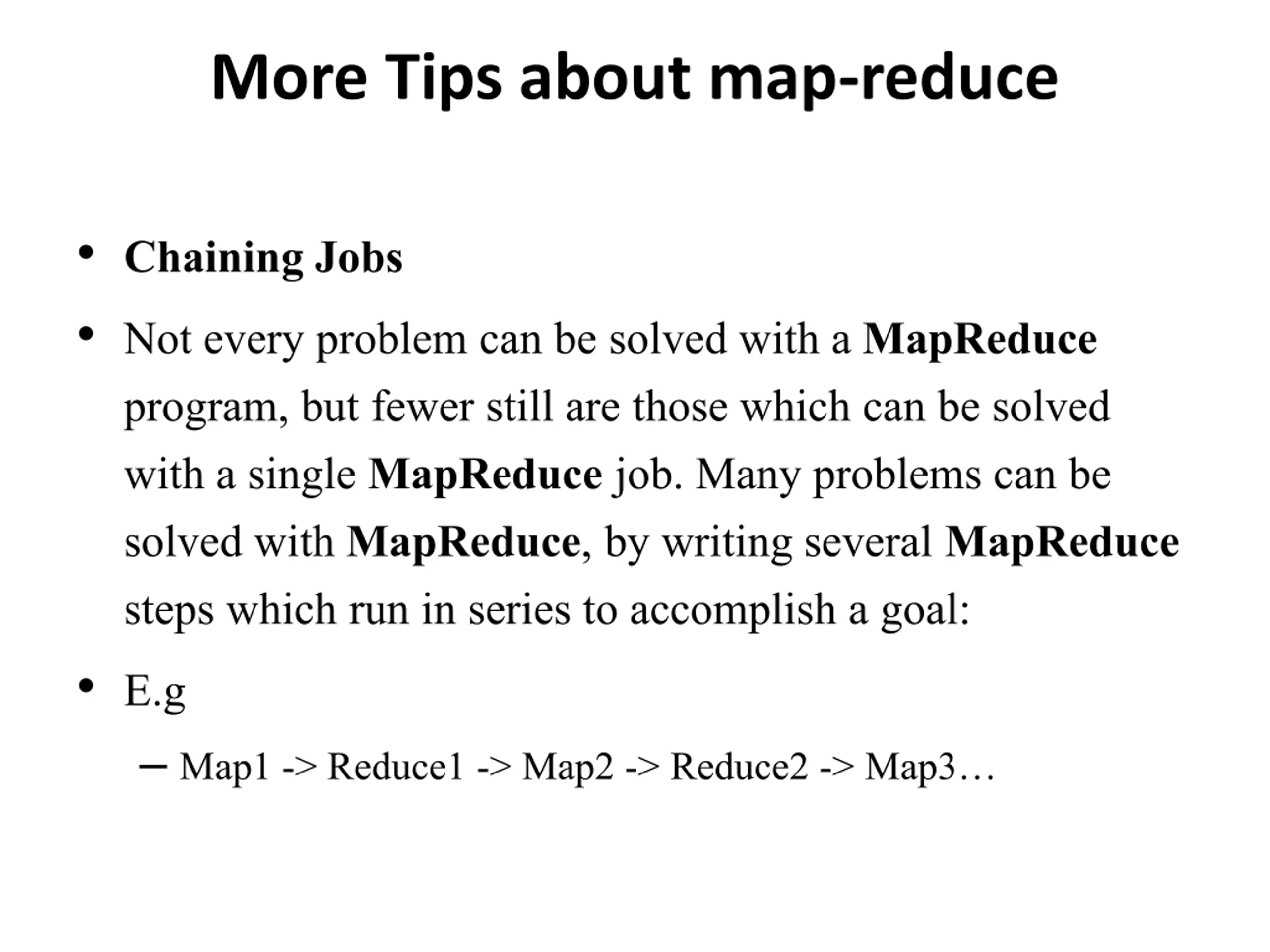 More Tips about map-reduce Chaining Jobs Not every problem can be solved with a MapReduce program, but fewer still are those which can be solved with a single MapReduce job. Many problems can be solved with MapReduce, by writing several MapReduce steps which run in series to accomplish a goal: E.g Map1 -> Reduce1 -> Map2 -> Reduce2 -> Map3