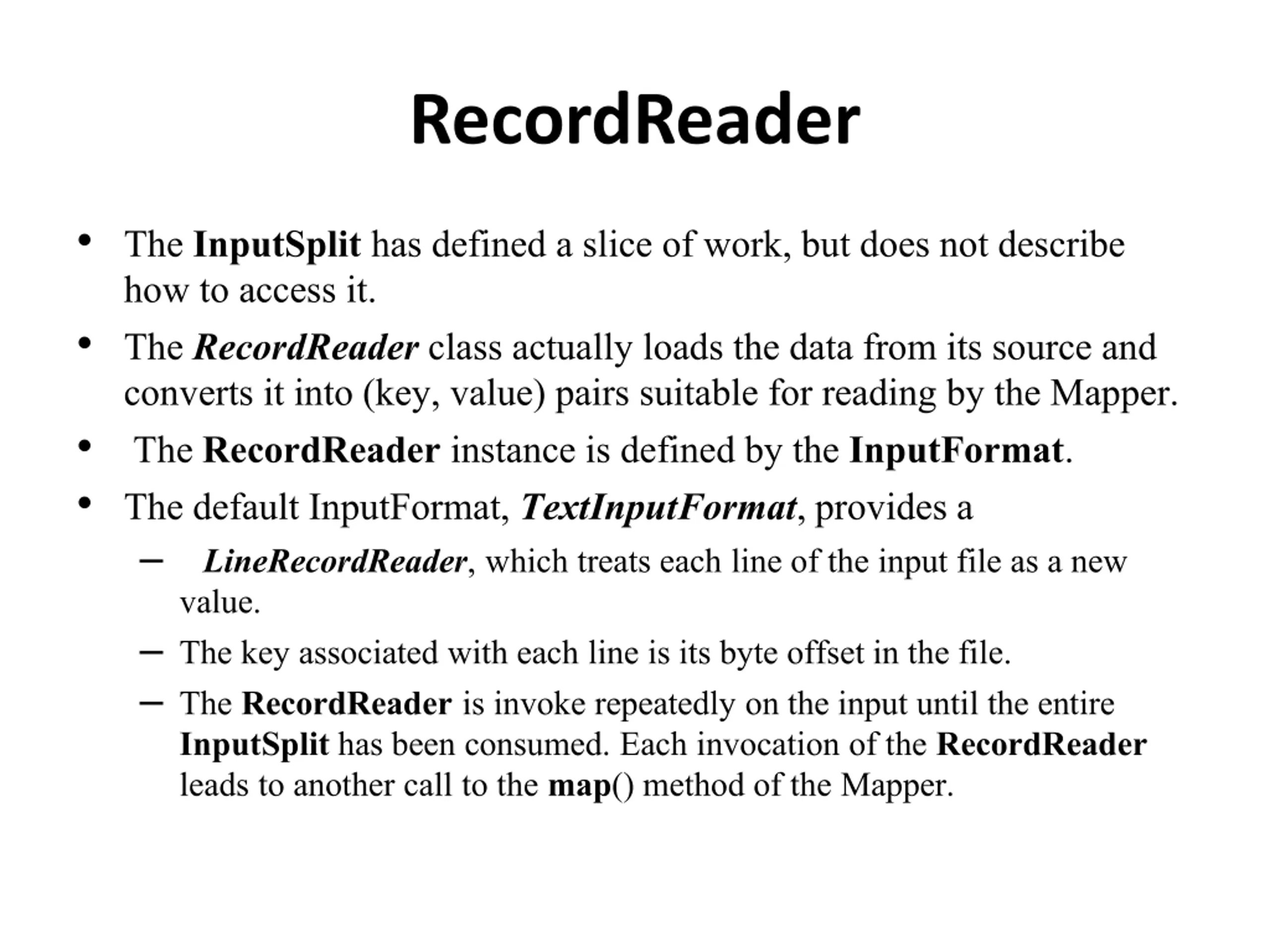 RecordReader The InputSplit has defined a slice of work, but does not describe how to access it. The RecordReaderclass actually loads the data from its source and converts it into (key, value) pairs suitable for reading by the Mapper. The RecordReader instance is defined by the InputFormat. The default InputFormat, TextInputFormat, provides a LineRecordReader, which treats each line of the input file as a new value. The key associated with each line is its byte offset in the file. The RecordReader is invoke repeatedly on the input until the entire InputSplithas been consumed. Each invocation of the RecordReader leads to another call to the map() method of the Mapper.