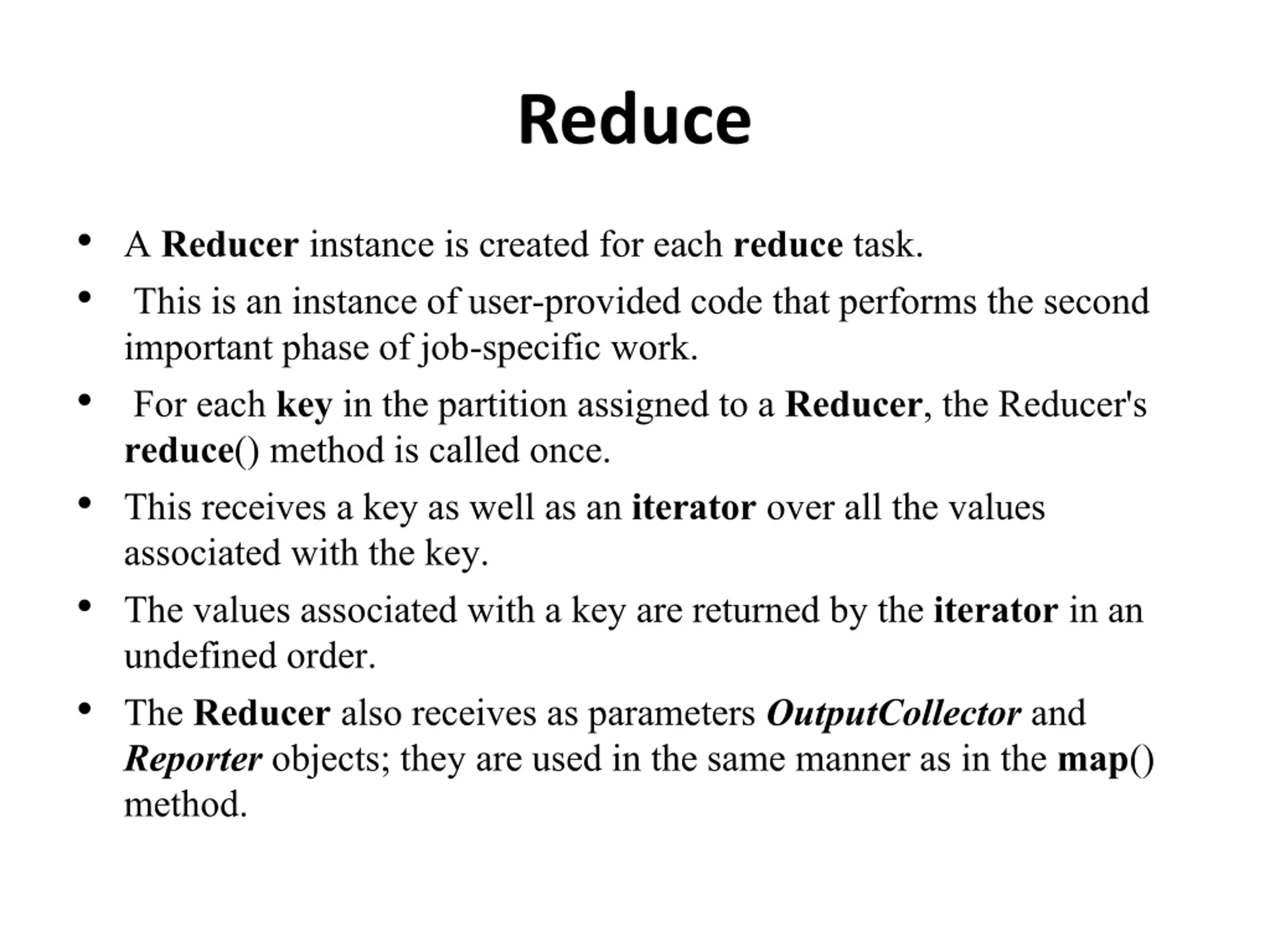 Reduce A Reducer instance is created for each reduce task. This is an instance of user-provided code that performs the second important phase of job-specific work. For each keyin the partition assigned to a Reducer, the Reducer's reduce() method is called once. This receives a key as well as an iterator over all the values associated with the key. The values associated with a key are returned by the iterator in an undefined order. The Reducer also receives as parameters OutputCollector and Reporterobjects; they are used in the same manner as in the map() method.