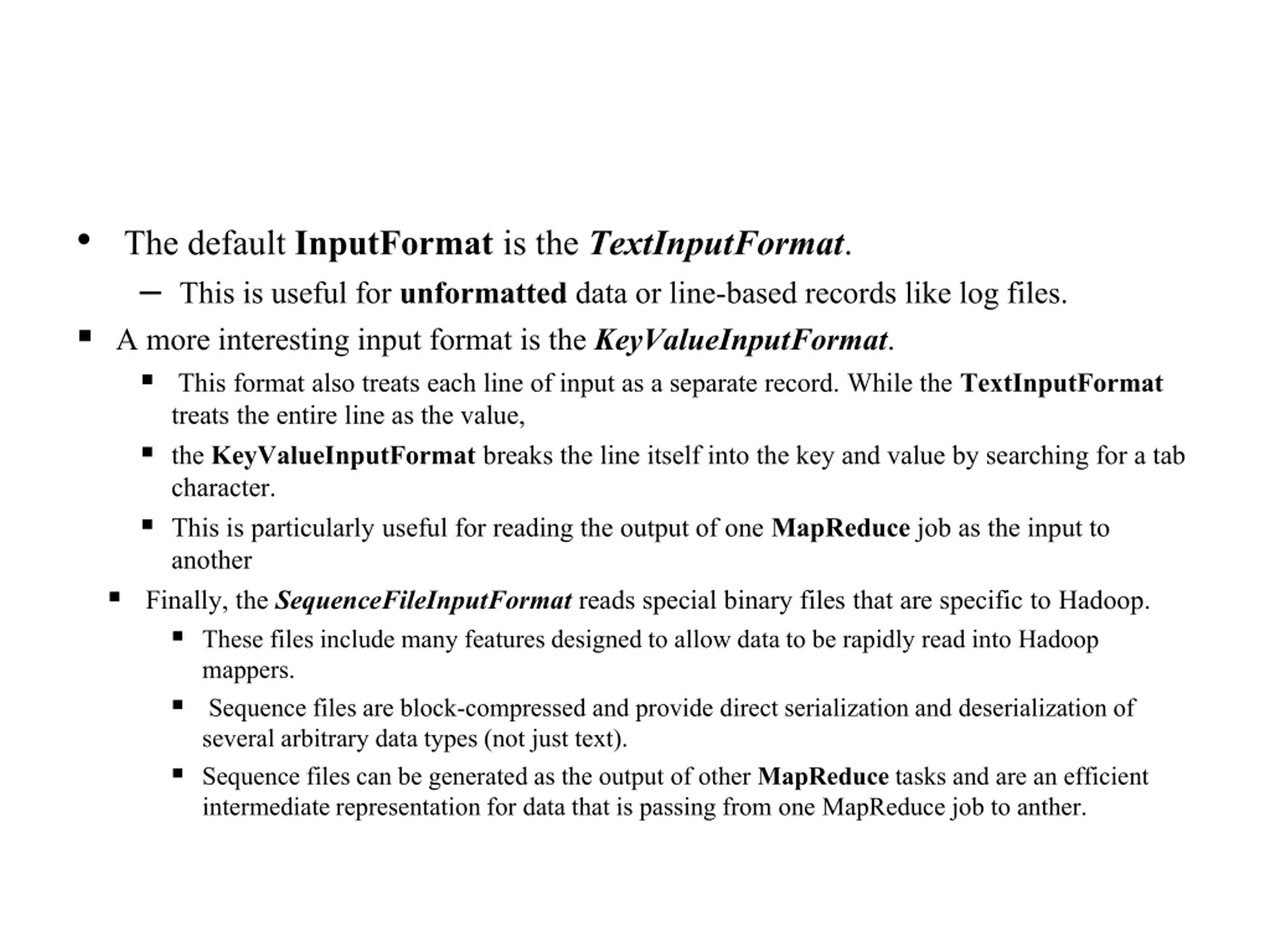The default InputFormat is the TextInputFormat. This is useful for unformatted data or line-based records like log files. A more interesting input format is the KeyValueInputFormat. This format also treats each line of input as a separate record. While the TextInputFormat treats the entire line as the value, the KeyValueInputFormat breaks the line itself into the key and value by searching for a tab character. This is particularly useful for reading the output of one MapReducejob as the input to another Finally, the SequenceFileInputFormat reads special binary files that are specific to Hadoop. These files include many features designed to allow data to be rapidly read into Hadoop mappers. Sequence files are block-compressed and provide direct serialization and deserializationof several arbitrary data types (not just text). Sequence files can be generated as the output of other MapReducetasks and are an efficient intermediate representation for data that is passing from one MapReducejob to anther.