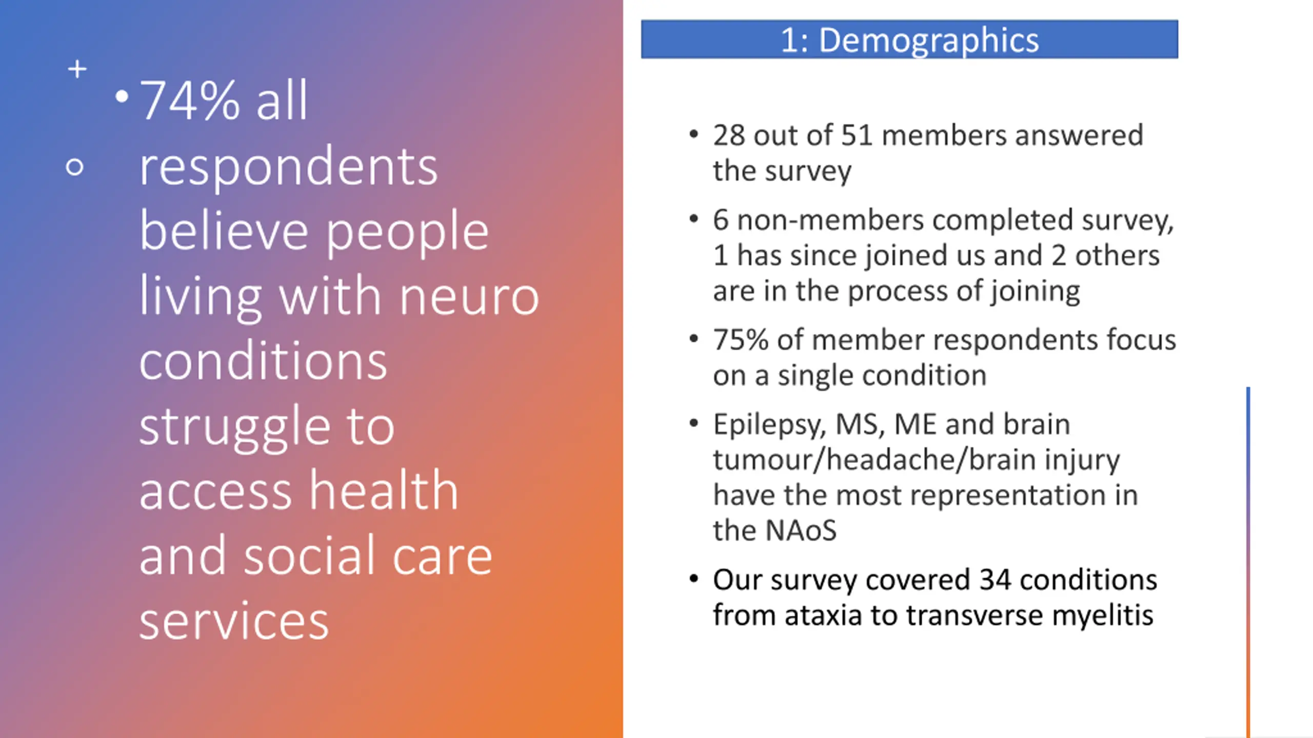 1: Demographics 74% all respondents believe people living with neuro conditions struggle to access health and social care services Our survey covered 34 conditions from ataxia to transverse myelitis