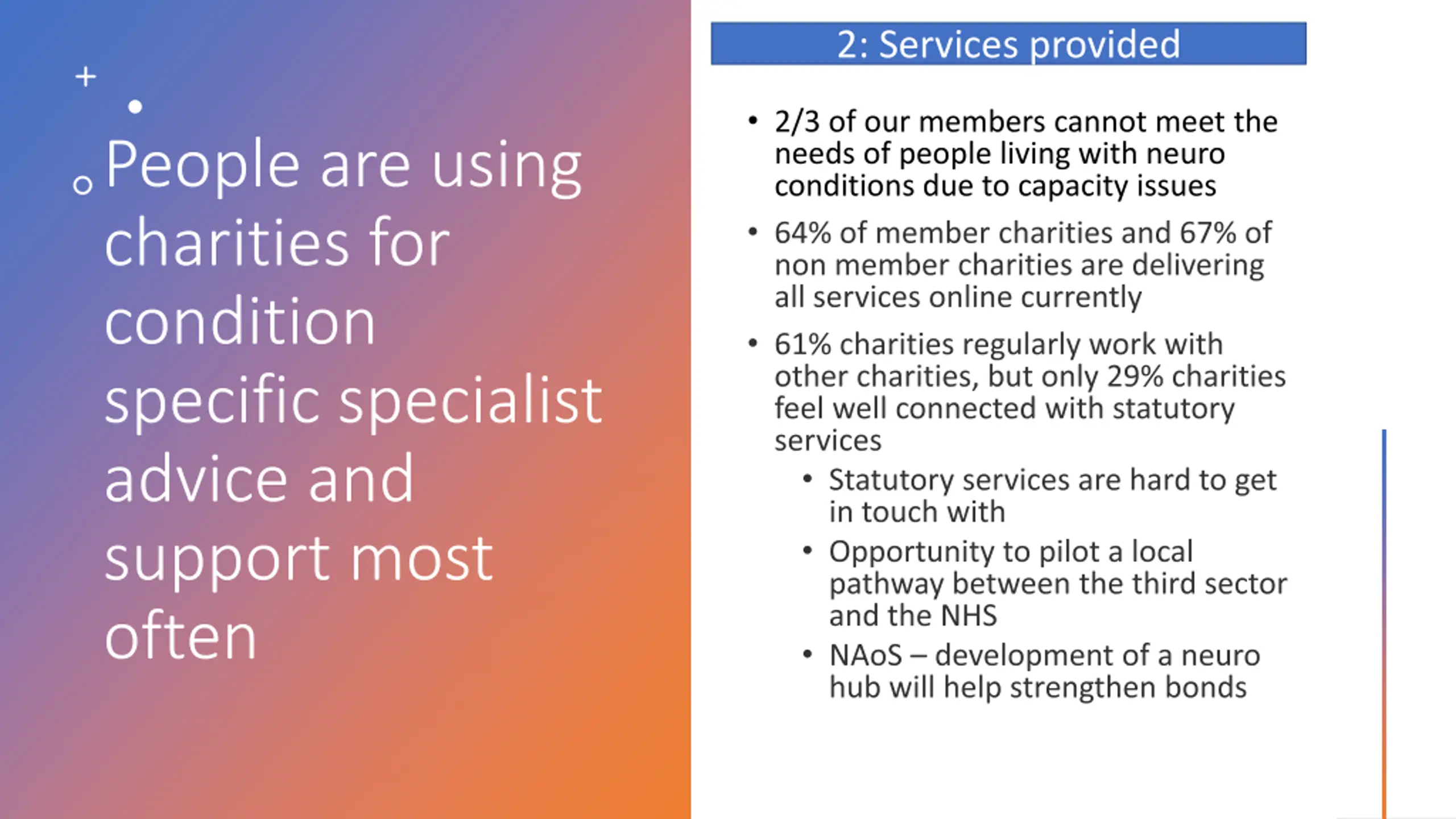 2: Services provided 2/3 of our members cannot meet the needs of people living with neuro conditions due to capacity issues People are using charities for condition specific specialist advice and support most often