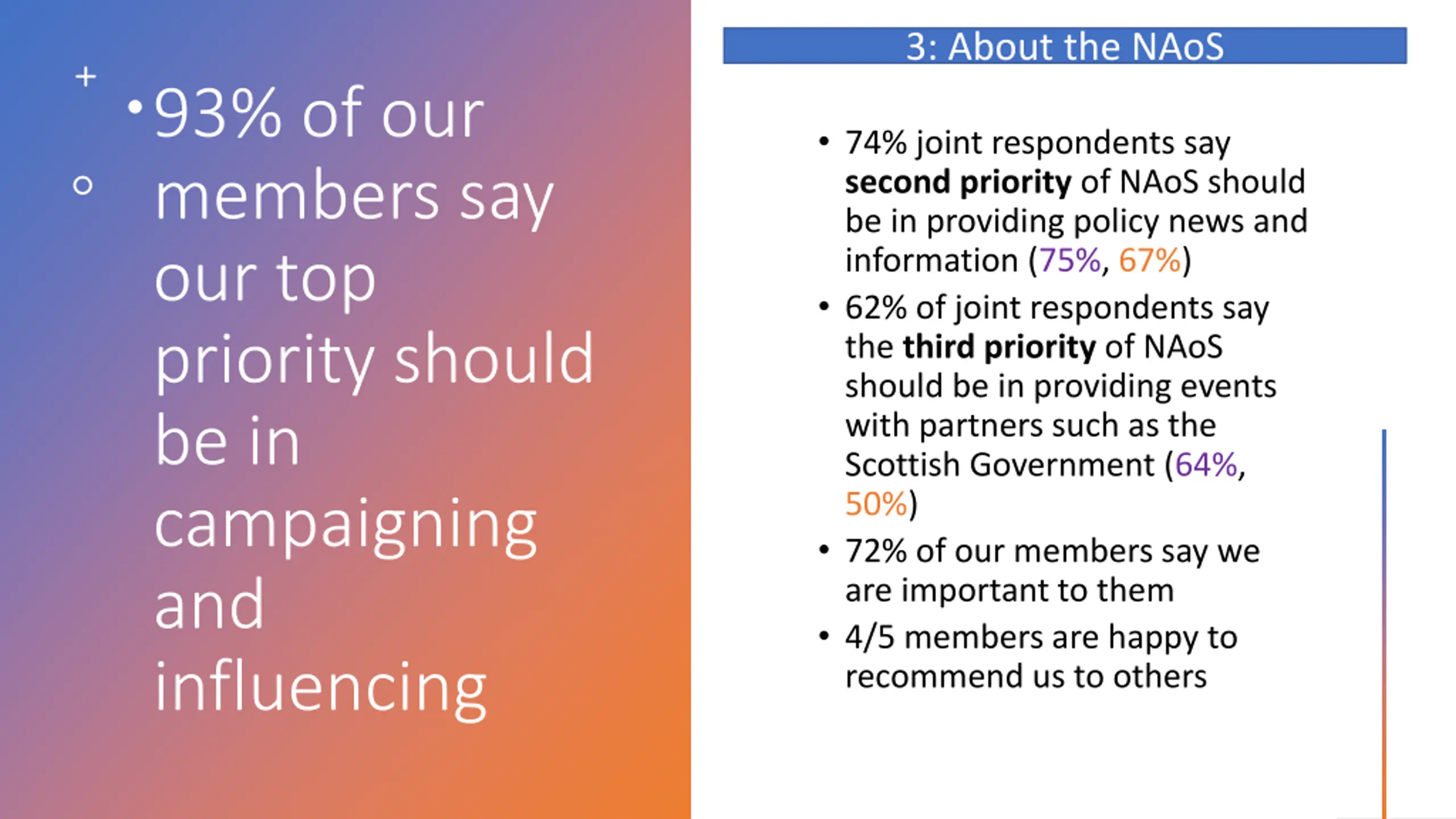 3: About the NAoS 93% of our members say our top priority should be in campaigning and influencing 74% joint respondents say second priority of NAoS should be in providing policy news and information (75%, 67%) 62% of joint respondents say the third priority of NAoS should be in providing events with partners such as the Scottish Government (64%, 50%) 72% of our members say we are important to them 4/5 members are happy to recommend us to others