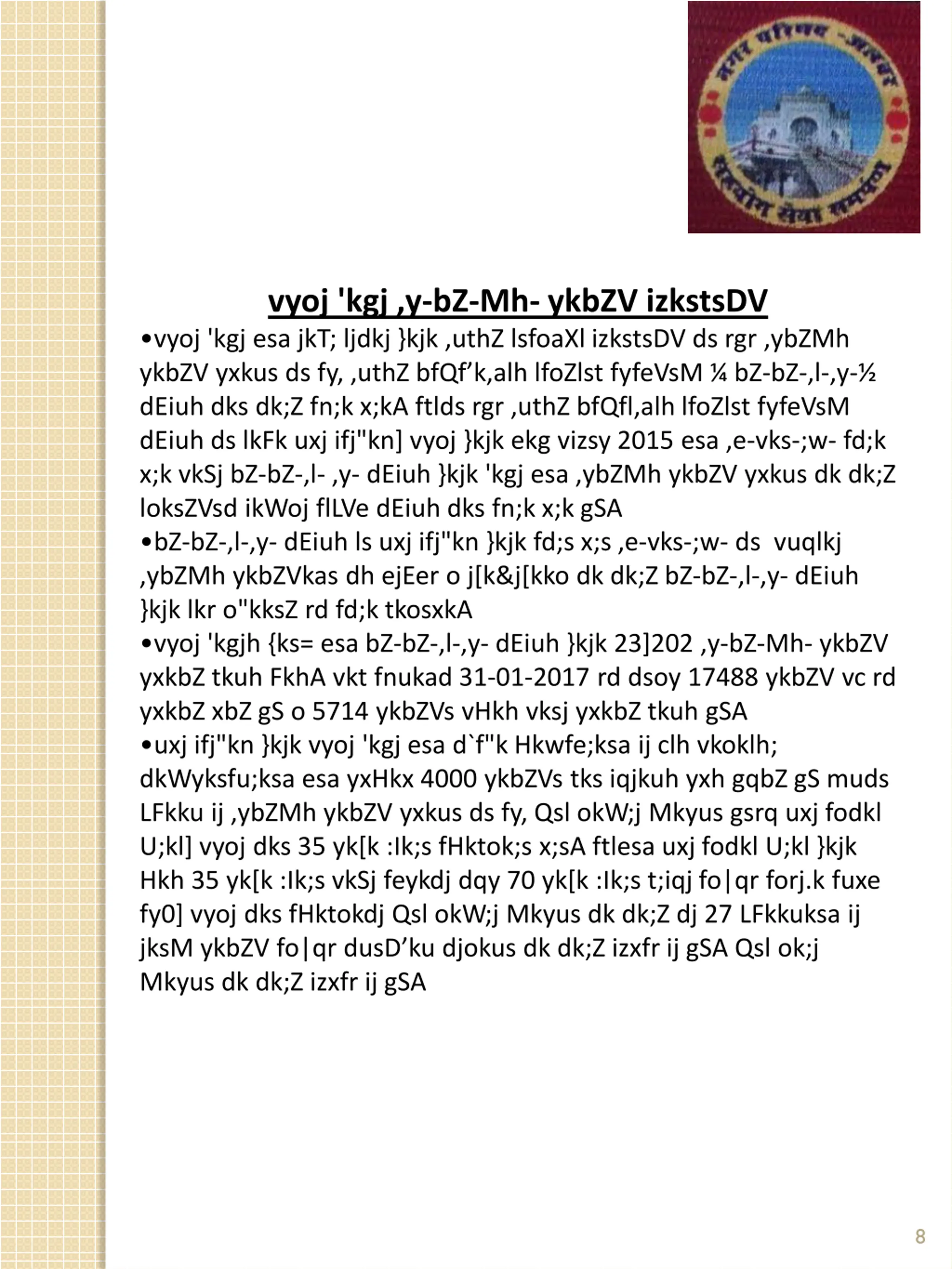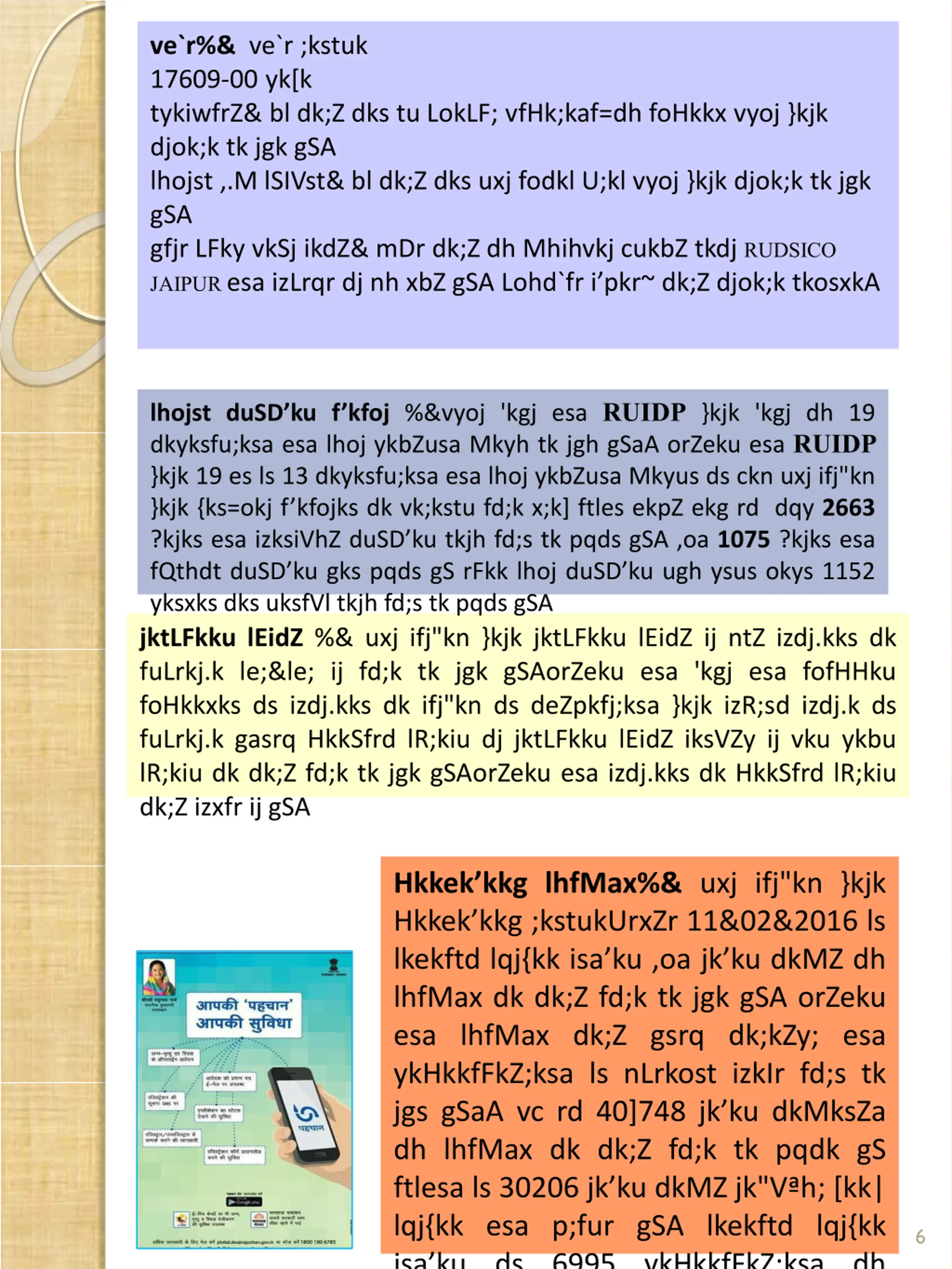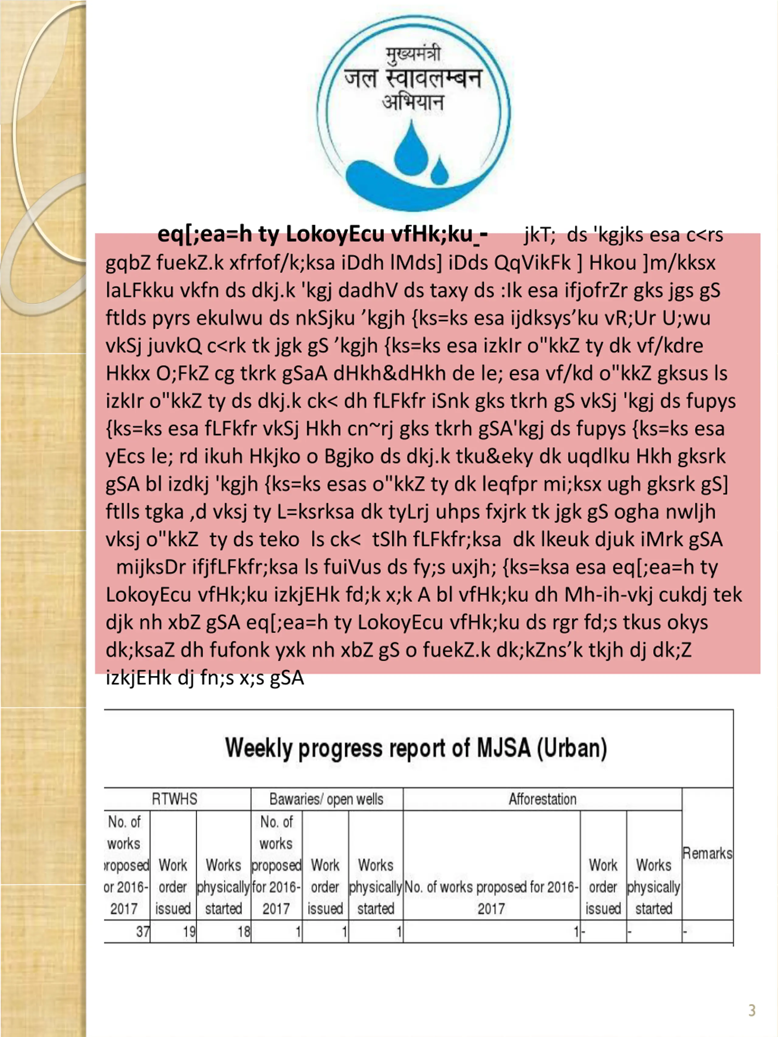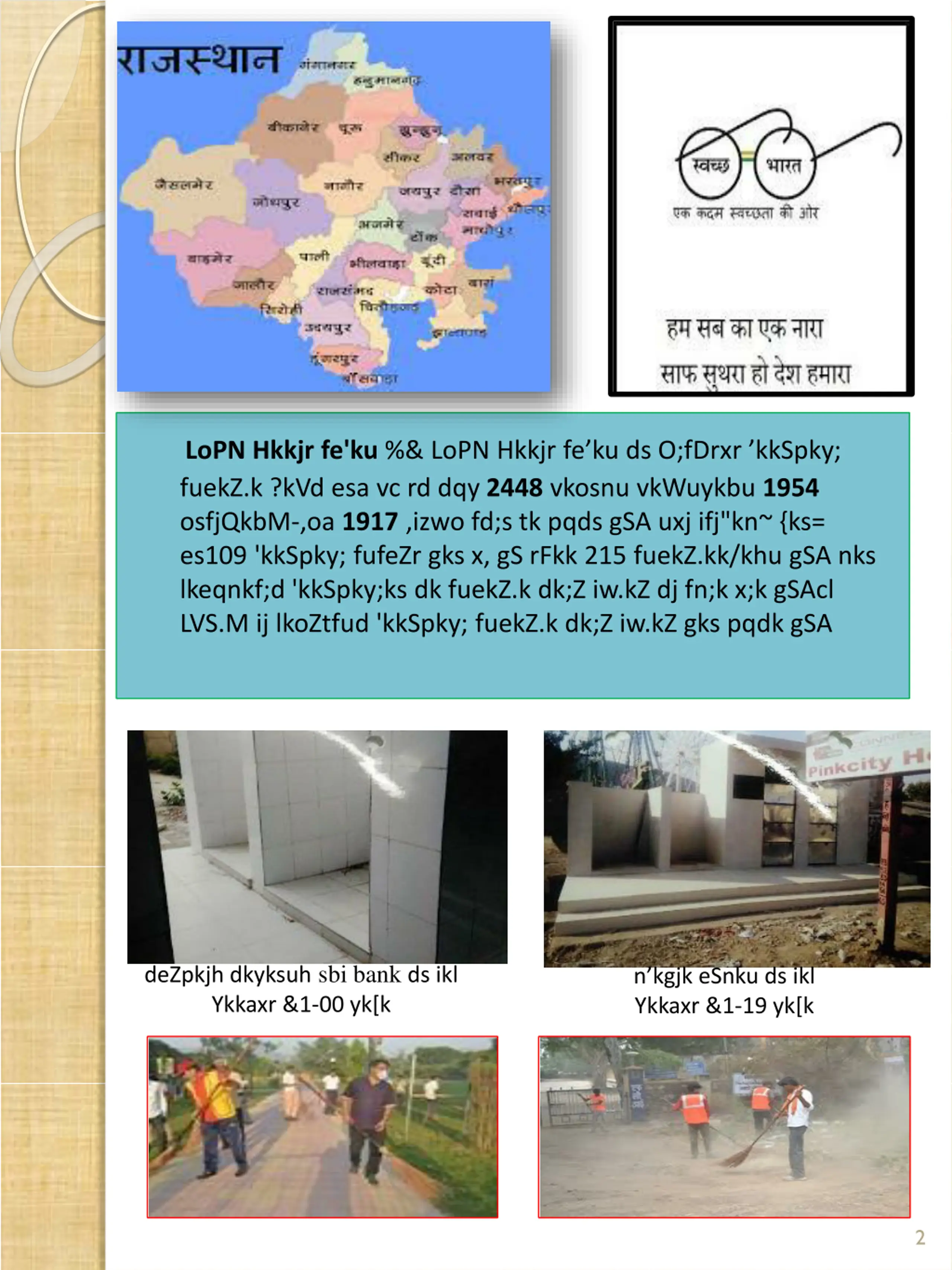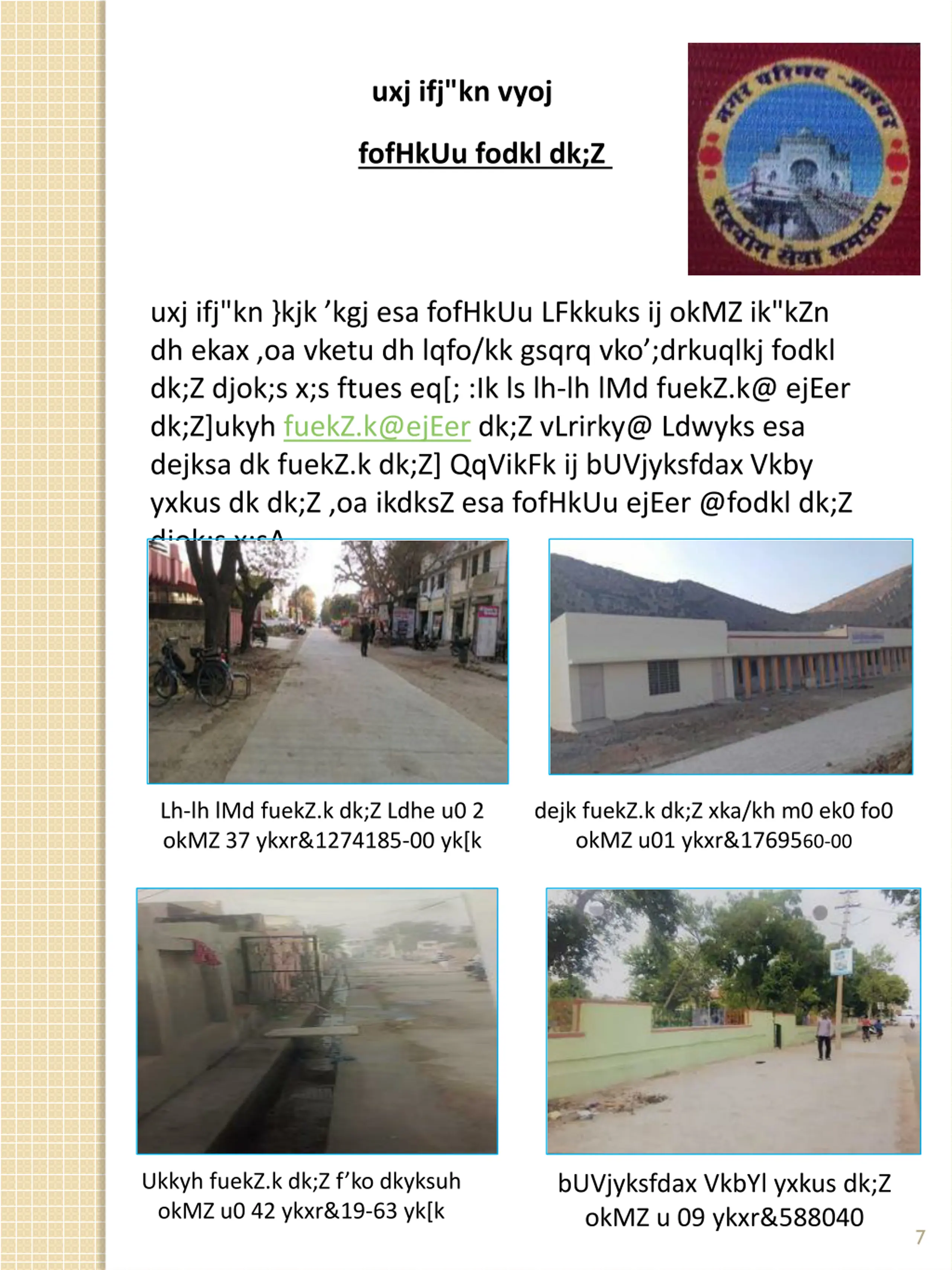 ve`r%& ve`r ;kstuk 17609-00 yk[k tykiwfrZ& bl dk;Z dks tu LokLF; vfHk;kaf=dh foHkkx vyoj }kjk djok;k tk jgk gSA lhojst ,.M lSIVst& bl dk;Z dks uxj fodkl U;kl vyoj }kjk djok;k tk jgk gSA gfjr LFky vkSj ikdZ& mDr dk;Z dh Mhihvkj cukbZ tkdj RUDSICO JAIPUR esa izLrqr dj nh xbZ gSA Lohd`fr i pkr~ dk;Z djok;k tkosxkA lhojst duSD kuf kfoj %&vyoj 'kgj esa RUIDP}kjk 'kgj dh 19 dkyksfu;ksa esa lhoj ykbZusa Mkyh tk jgh gSaA orZeku esa RUIDP }kjk 19 es ls 13 dkyksfu;ksa esa lhoj ykbZusa Mkyus ds ckn uxj ifj"kn }kjk {ks=okj f kfojks dk vk;kstu fd;k x;k] ftles ekpZekg rd dqy 2663 ?kjks esa izksiVhZ duSD kutkjhfd;s tk pqds gSA ,oa 1075 ?kjks esa fQthdt duSD ku gks pqds gS rFkk lhojduSD kuugh ysus okys 1152 yksxks dks uksfVl tkjh fd;s tk pqds gSA jktLFkku lEidZ %& uxj ifj"kn }kjk jktLFkku lEidZ ij ntZ izdj.kks dk fuLrkj.k le;≤ ij fd;k tk jgk gSAorZeku esa 'kgj esa fofHHku foHkkxks ds izdj.kks dk ifj"kn ds deZpkfj;ksa }kjk izR;sd izdj.k ds fuLrkj.k gasrq HkkSfrd lR;kiu dj jktLFkku lEidZ iksVZy ij vku ykbu lR;kiu dk dk;Z fd;k tk jgk gSAorZeku esa izdj.kks dk HkkSfrd lR;kiu dk;Z izxfr ij gSA Hkkek kkg lhfMax%& uxj ifj"kn }kjk Hkkek kkg ;kstukUrxZr 11&02&2016 ls lkekftd lqj{kk isa ku ,oa jk ku dkMZ dh lhfMax dk dk;Z fd;k tk jgk gSA orZeku esa lhfMax dk;Z gsrq dk;kZy; esa ykHkkfFkZ;ksa ls nLrkost izkIr fd;s tk jgs gSaA vc rd 40]748 jk ku dkMksZa dh lhfMax dk dk;Z fd;k tk pqdk gS ftlesa ls 30206 jk ku dkMZ jk"V h; [kk| lqj{kk esa p;fur gSA lkekftd lqj{kk isa ku ds 6995 ykHkkfFkZ;ksa dh 6