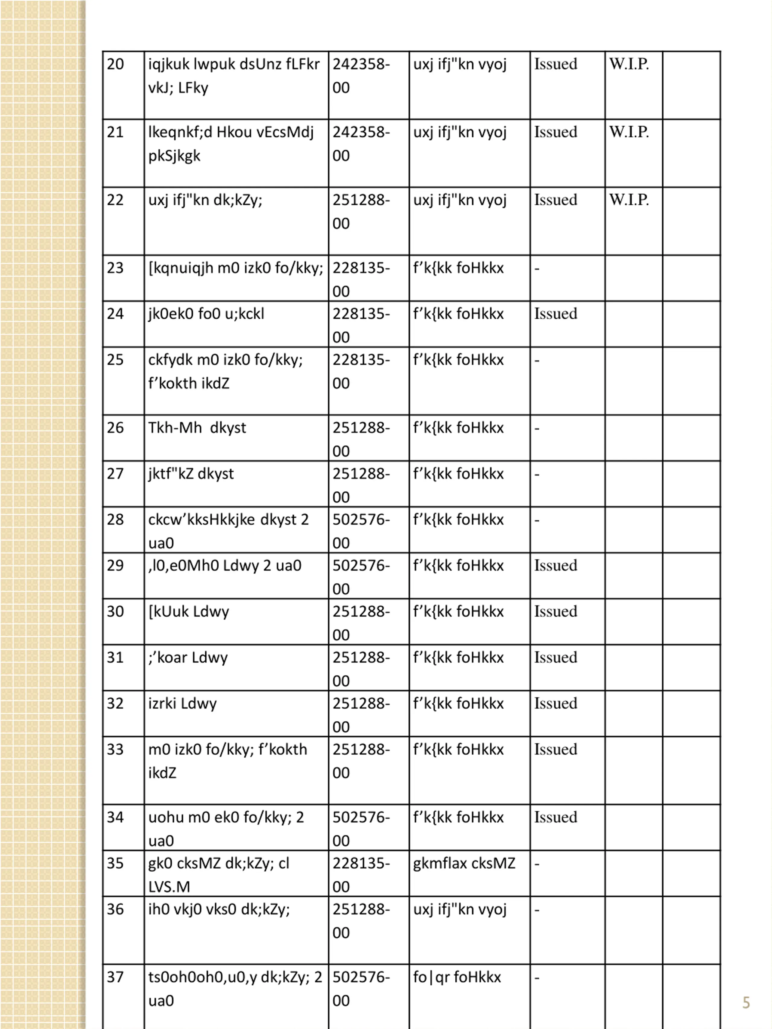Issued W.I.P. 20 iqjkuk lwpuk dsUnz fLFkr vkJ; LFky 242358- 00 uxj ifj"kn vyoj Issued W.I.P. 21 lkeqnkf;d Hkou vEcsMdj pkSjkgk 242358- 00 uxj ifj"kn vyoj Issued W.I.P. 22 uxj ifj"kn dk;kZy; 251288- 00 uxj ifj"kn vyoj - 23 [kqnuiqjh m0 izk0 fo/kky; 228135- f k{kk foHkkx 00 228135- 00 228135- 00 Issued 24 jk0ek0 fo0 u;kckl f k{kk foHkkx - 25 ckfydk m0 izk0 fo/kky; f kokth ikdZ f k{kk foHkkx - 26 Tkh-Mh dkyst 251288- 00 251288- 00 502576- 00 502576- 00 251288- 00 251288- 00 251288- 00 251288- 00 f k{kk foHkkx - 27 jktf"kZ dkyst f k{kk foHkkx mu f k{kk foHkkx - 28 ckcw kksHkkjke dkyst 2 ua0 ,l0,e0Mh0 Ldwy 2 ua0 Issued 29 f k{kk foHkkx Issued 30 [kUuk Ldwy f k{kk foHkkx Issued 31 ; koar Ldwy f k{kk foHkkx Issued 32 izrki Ldwy f k{kk foHkkx Issued 33 m0 izk0 fo/kky; f kokth ikdZ f k{kk foHkkx Issued 34 uohu m0 ek0 fo/kky; 2 ua0 gk0 cksMZ dk;kZy; cl LVS.M ih0 vkj0 vks0 dk;kZy; 502576- 00 228135- 00 251288- 00 f k{kk foHkkx - 35 gkmflax cksMZ - 36 uxj ifj"kn vyoj - 37 ts0oh0oh0,u0,y dk;kZy; 2 ua0 502576- 00 fo|qr foHkkx 5