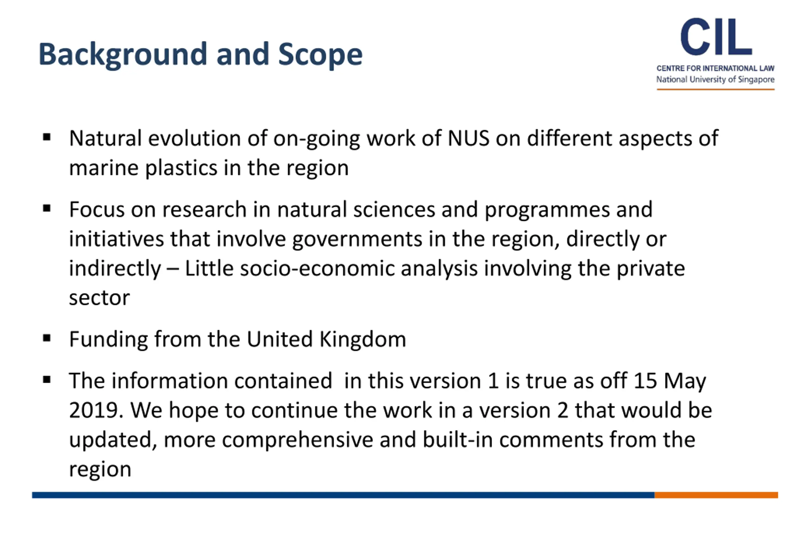Background and Scope Natural evolution of on-going work of NUS on different aspects of marine plastics in the region Focus on research in natural sciences and programmes and initiatives that involve governments in the region, directly or indirectly Little socio-economic analysis involving the private sector Funding from the United Kingdom The information contained in this version 1 is true as off 15 May 2019. We hope to continue the work in a version 2 that would be updated, more comprehensive and built-in comments from the region