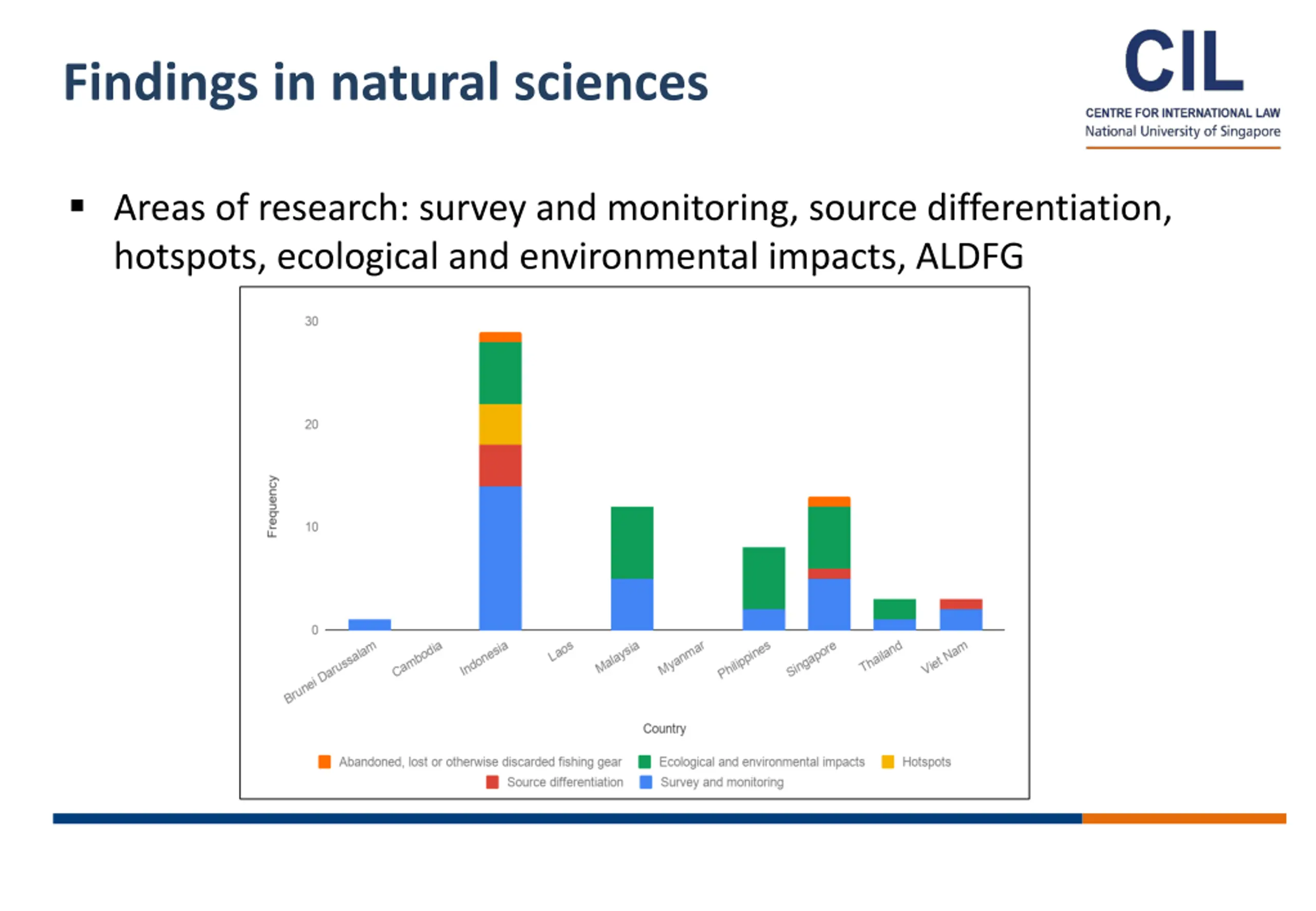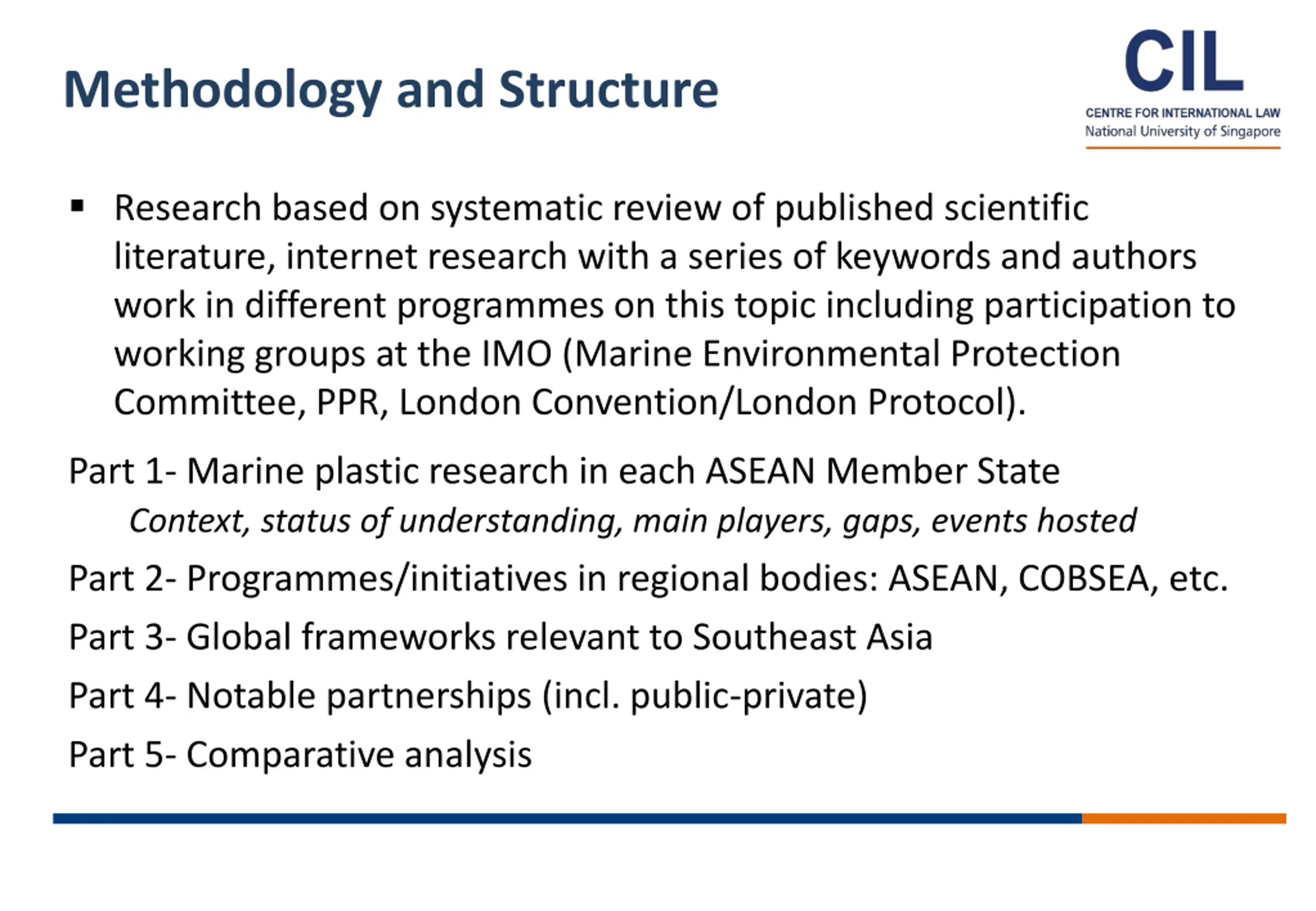 Methodology and Structure Research based on systematic review of published scientific literature, internet research with a series of keywords and authors work in different programmes on this topic including participation to working groups at the IMO (Marine Environmental Protection Committee, PPR, London Convention/London Protocol). Part 1- Marine plastic research in each ASEAN Member State Context, status of understanding, main players, gaps, events hosted Part 2- Programmes/initiatives in regional bodies: ASEAN, COBSEA, etc. Part 3- Global frameworks relevant to Southeast Asia Part 4- Notable partnerships (incl. public-private) Part 5- Comparative analysis