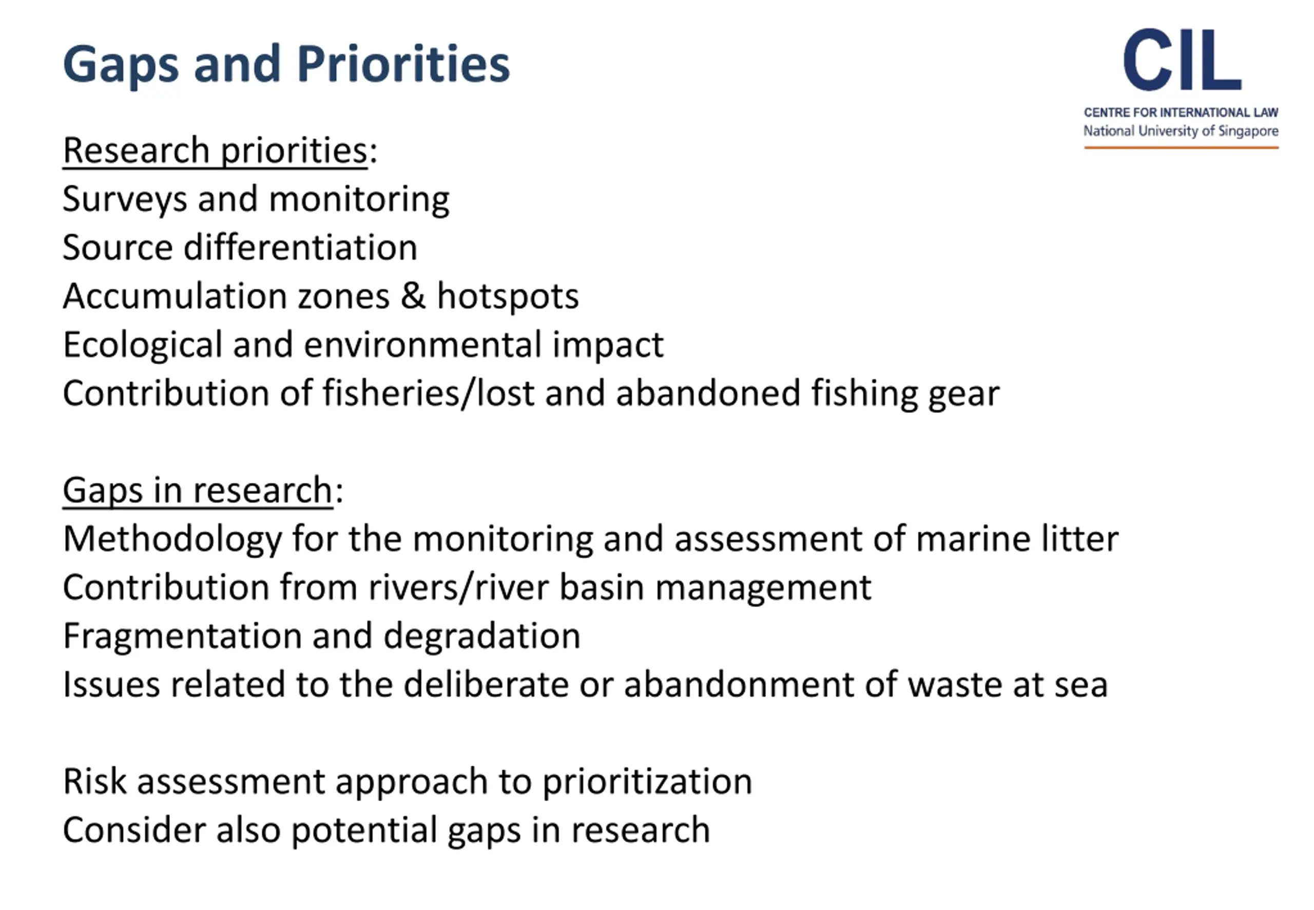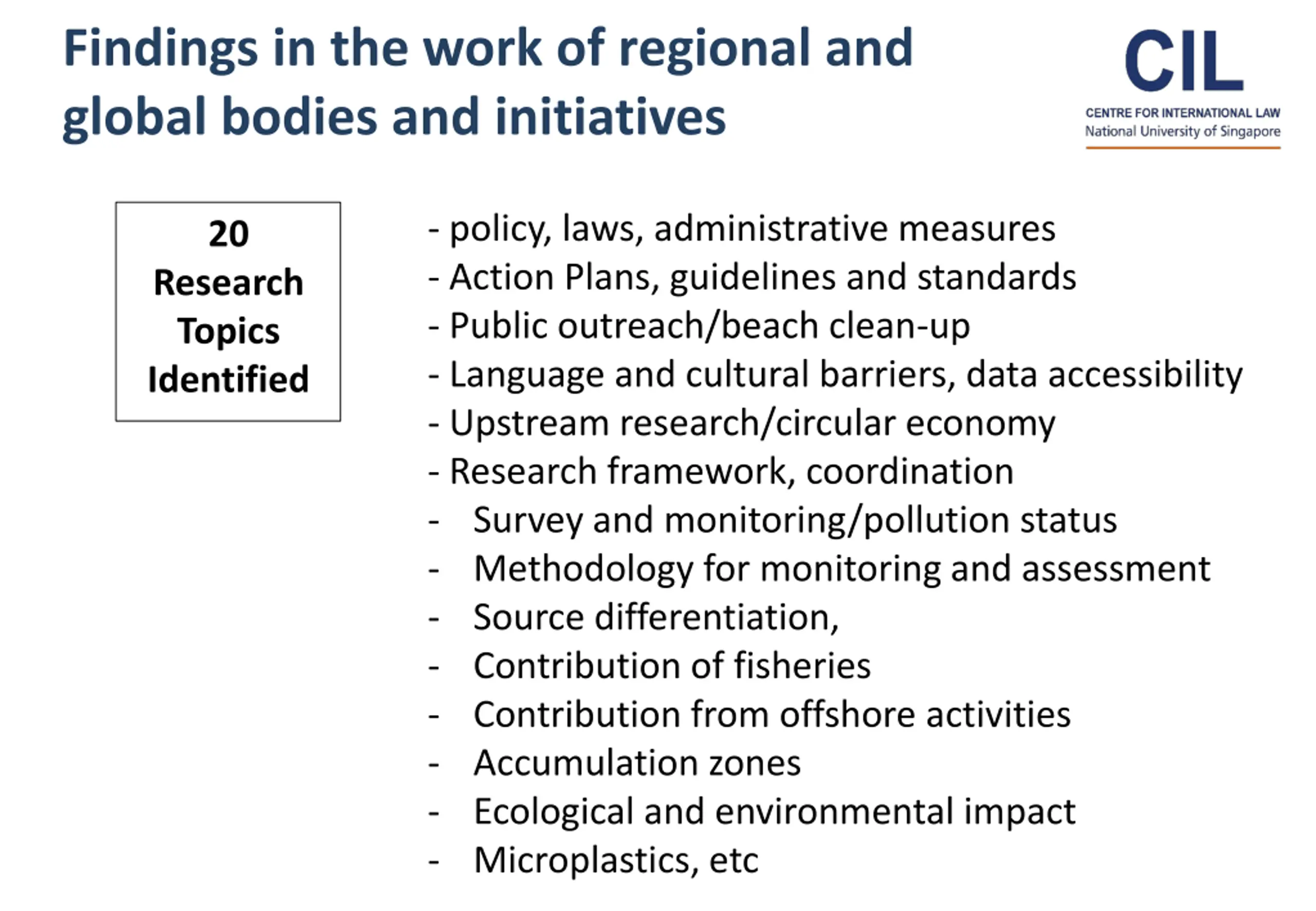 Findings in the work of regional and global bodies and initiatives - policy, laws, administrative measures - Action Plans, guidelines and standards - Public outreach/beach clean-up - Language and cultural barriers, data accessibility - Upstream research/circular economy - Research framework, coordination - Survey and monitoring/pollution status - Methodology for monitoring and assessment - Source differentiation, - Contribution of fisheries - Contribution from offshore activities - Accumulation zones - Ecological and environmental impact - Microplastics, etc 20 Research Topics Identified