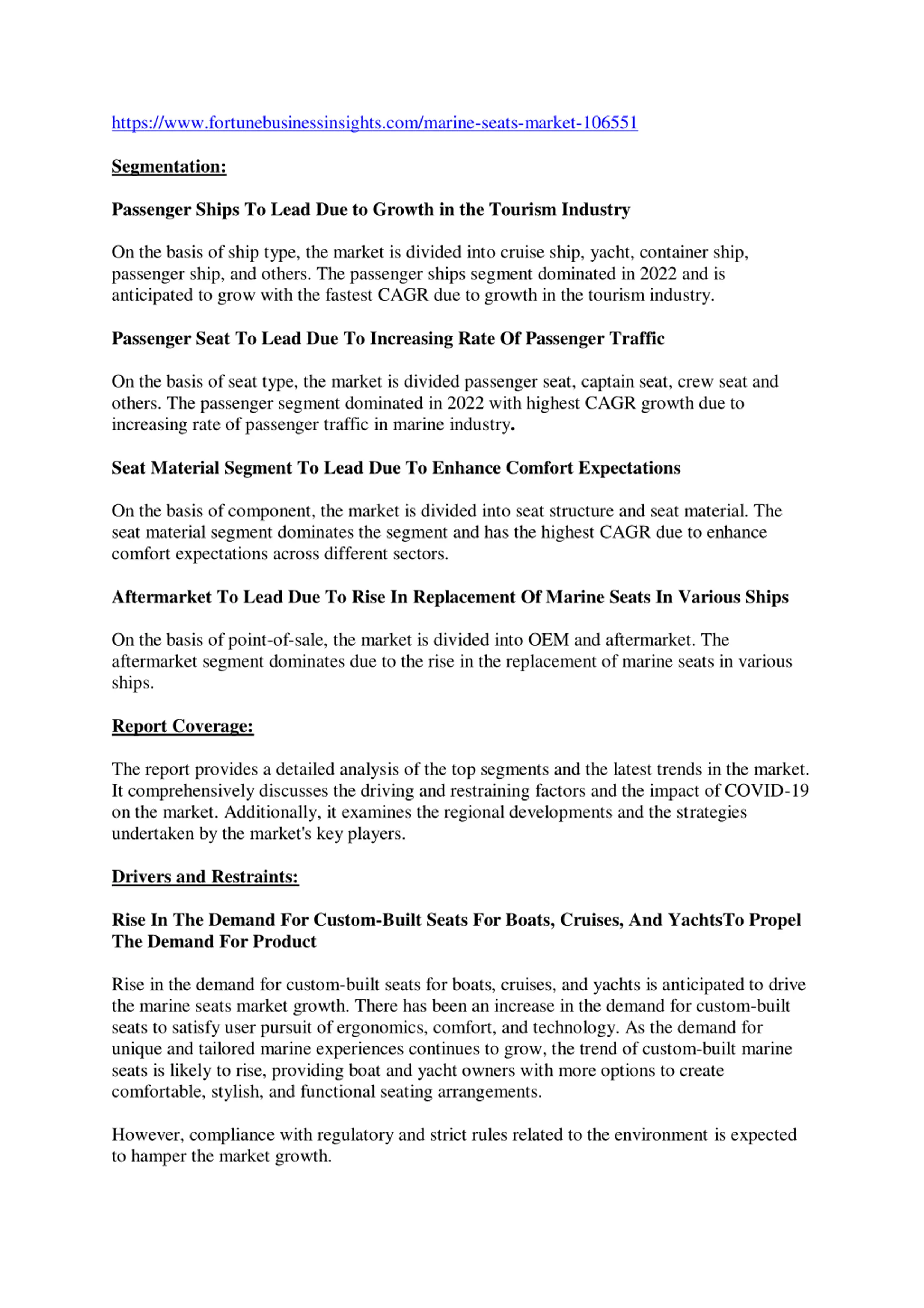 https://www.fortunebusinessinsights.com/marine-seats-market-106551 Segmentation: Passenger Ships To Lead Due to Growth in the Tourism Industry On the basis of ship type, the market is divided into cruise ship, yacht, container ship, passenger ship, and others. The passenger ships segment dominated in 2022 and is anticipated to grow with the fastest CAGR due to growth in the tourism industry. Passenger Seat To Lead Due To Increasing Rate Of Passenger Traffic On the basis of seat type, the market is divided passenger seat, captain seat, crew seat and others. The passenger segment dominated in 2022 with highest CAGR growth due to increasing rate of passenger traffic in marine industry. Seat Material Segment To Lead Due To Enhance Comfort Expectations On the basis of component, the market is divided into seat structure and seat material. The seat material segment dominates the segment and has the highest CAGR due to enhance comfort expectations across different sectors. Aftermarket To Lead Due To Rise In Replacement Of Marine Seats In Various Ships On the basis of point-of-sale, the market is divided into OEM and aftermarket. The aftermarket segment dominates due to the rise in the replacement of marine seats in various ships. Report Coverage: The report provides a detailed analysis of the top segments and the latest trends in the market. It comprehensively discusses the driving and restraining factors and the impact of COVID-19 on the market. Additionally, it examines the regional developments and the strategies undertaken by the market's key players. Drivers and Restraints: Rise In The Demand For Custom-Built Seats For Boats, Cruises, And YachtsTo Propel The Demand For Product Rise in the demand for custom-built seats for boats, cruises, and yachts is anticipated to drive the marine seats market growth. There has been an increase in the demand for custom-built seats to satisfy user pursuit of ergonomics, comfort, and technology. As the demand for unique and tailored marine experiences continues to grow, the trend of custom-built marine seats is likely to rise, providing boat and yacht owners with more options to create comfortable, stylish, and functional seating arrangements. However, compliance with regulatory and strict rules related to the environment is expected to hamper the market growth.