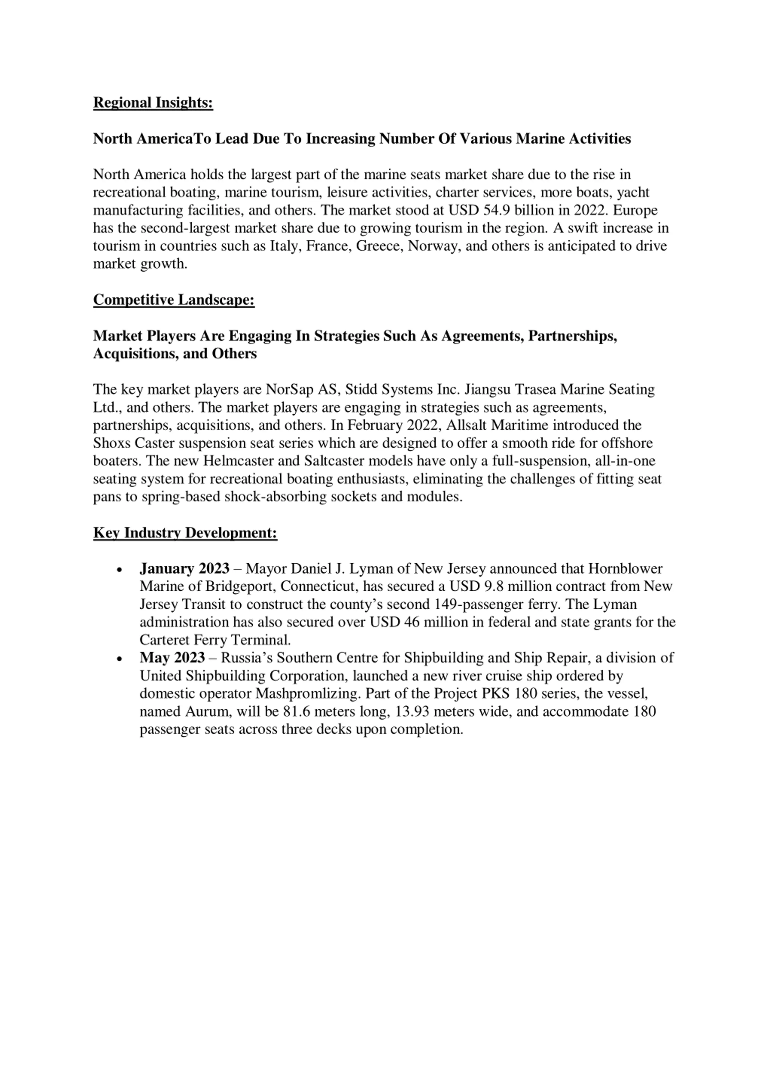 Regional Insights: North AmericaTo Lead Due To Increasing Number Of Various Marine Activities North America holds the largest part of the marine seats market share due to the rise in recreational boating, marine tourism, leisure activities, charter services, more boats, yacht manufacturing facilities, and others. The market stood at USD 54.9 billion in 2022. Europe has the second-largest market share due to growing tourism in the region. A swift increase in tourism in countries such as Italy, France, Greece, Norway, and others is anticipated to drive market growth. Competitive Landscape: Market Players Are Engaging In Strategies Such As Agreements, Partnerships, Acquisitions, and Others The key market players are NorSap AS, Stidd Systems Inc. Jiangsu Trasea Marine Seating Ltd., and others. The market players are engaging in strategies such as agreements, partnerships, acquisitions, and others. In February 2022, Allsalt Maritime introduced the Shoxs Caster suspension seat series which are designed to offer a smooth ride for offshore boaters. The new Helmcaster and Saltcaster models have only a full-suspension, all-in-one seating system for recreational boating enthusiasts, eliminating the challenges of fitting seat pans to spring-based shock-absorbing sockets and modules. Key Industry Development: January 2023 Mayor Daniel J. Lyman of New Jersey announced that Hornblower Marine of Bridgeport, Connecticut, has secured a USD 9.8 million contract from New Jersey Transit to construct the county s second 149-passenger ferry. The Lyman administration has also secured over USD 46 million in federal and state grants for the Carteret Ferry Terminal. May 2023 Russia s Southern Centre for Shipbuilding and Ship Repair, a division of United Shipbuilding Corporation, launched a new river cruise ship ordered by domestic operator Mashpromlizing. Part of the Project PKS 180 series, the vessel, named Aurum, will be 81.6 meters long, 13.93 meters wide, and accommodate 180 passenger seats across three decks upon completion.