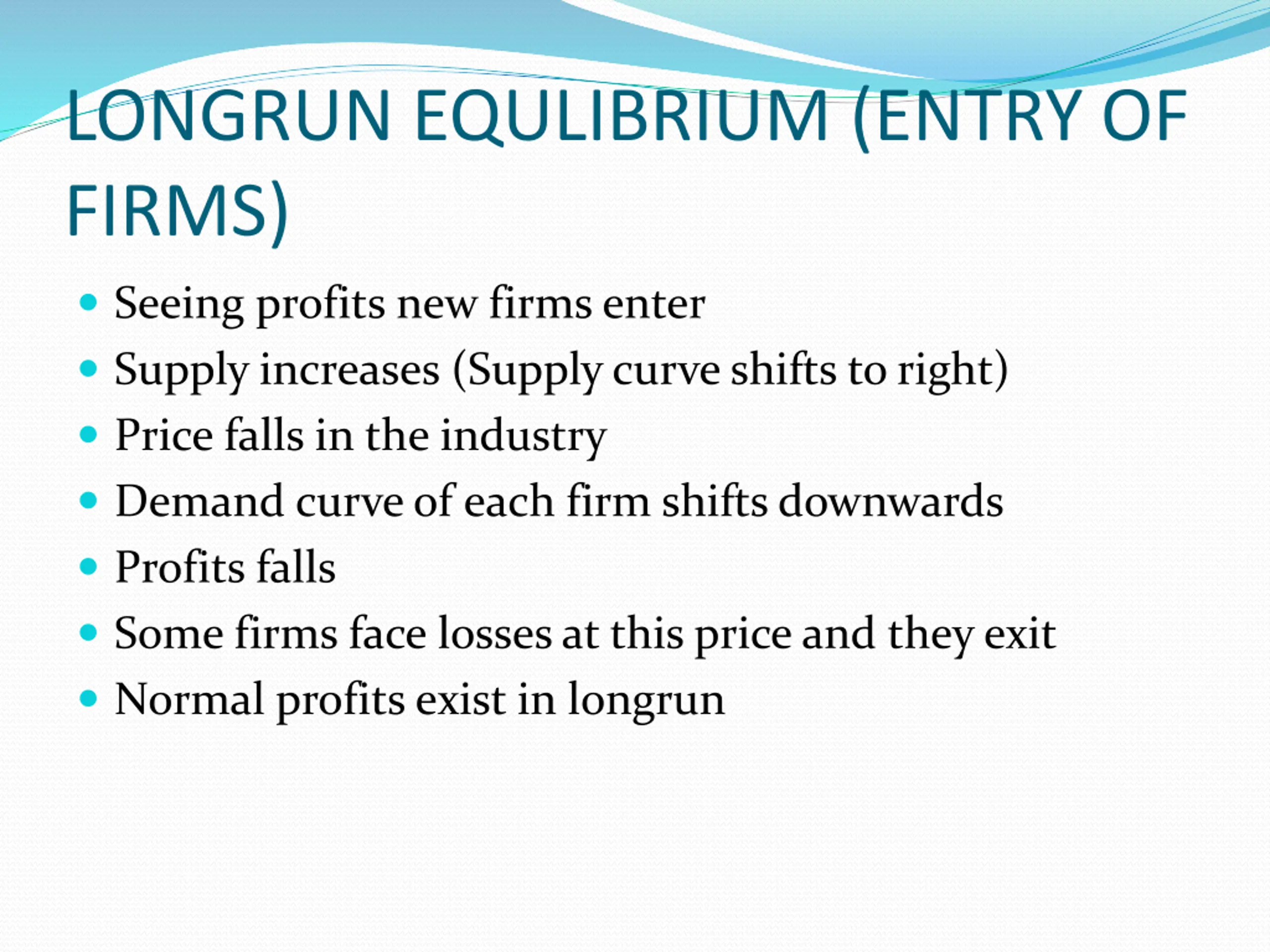 LONGRUN EQULIBRIUM (ENTRY OF FIRMS) Seeing profits new firms enter Supply increases (Supply curve shifts to right) Price falls in the industry Demand curve of each firm shifts downwards Profits falls Some firms face losses at this price and they exit Normal profits exist in longrun