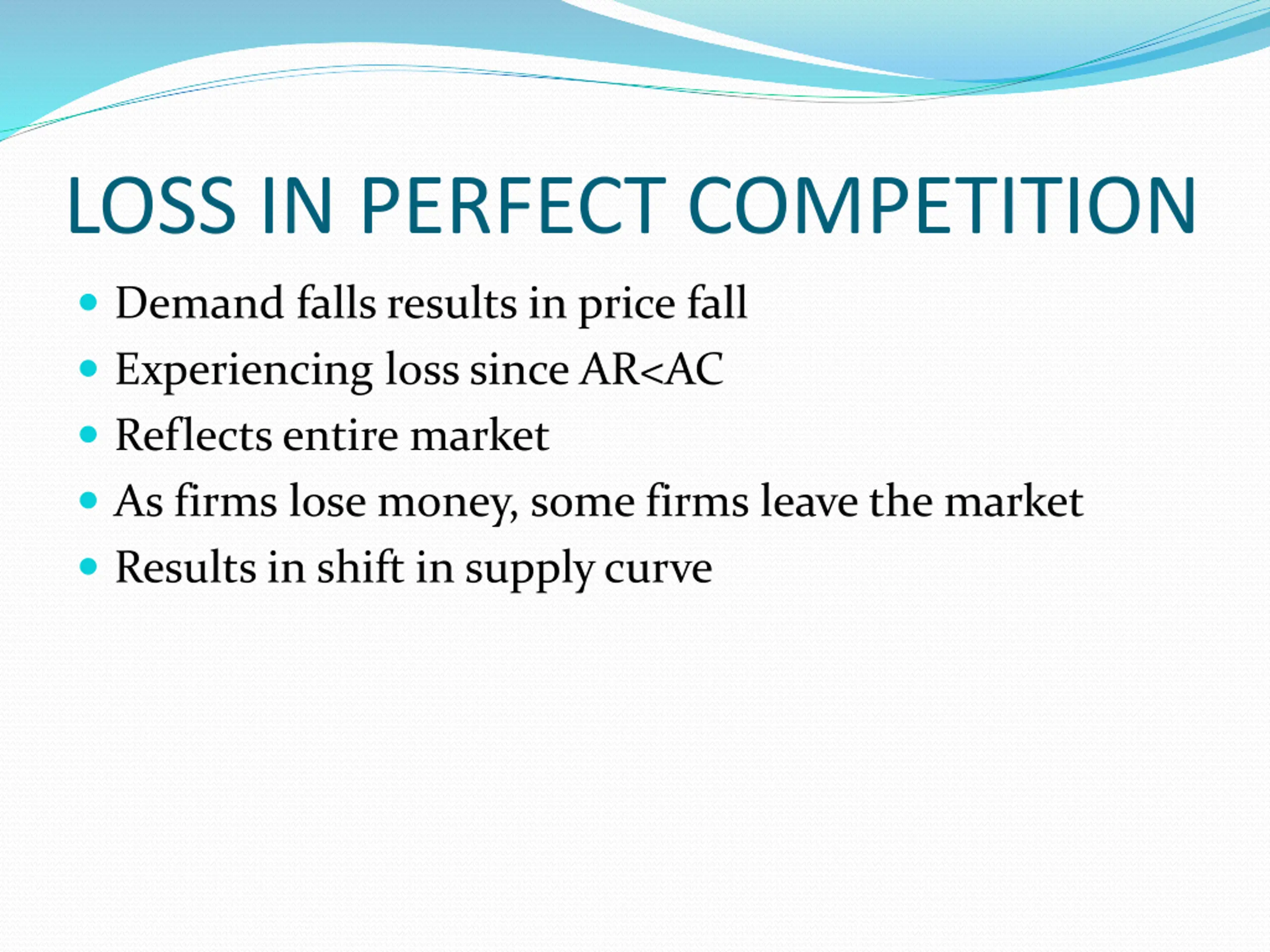 LOSS IN PERFECT COMPETITION Demand falls results in price fall Experiencing loss since AR<AC Reflects entire market As firms lose money, some firms leave the market Results in shift in supply curve