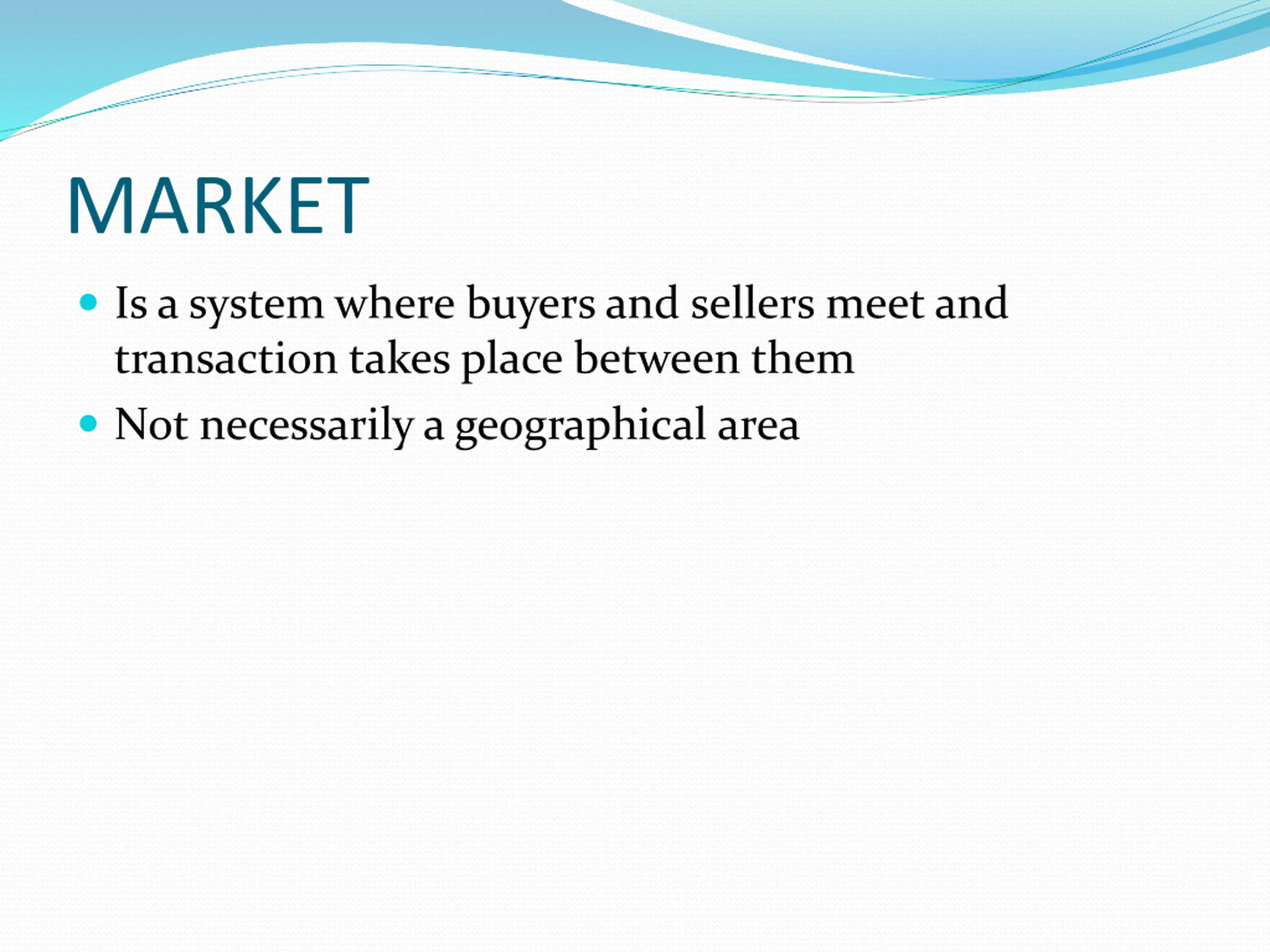 MARKET Is a system where buyers and sellers meet and transaction takes place between them Not necessarily a geographical area