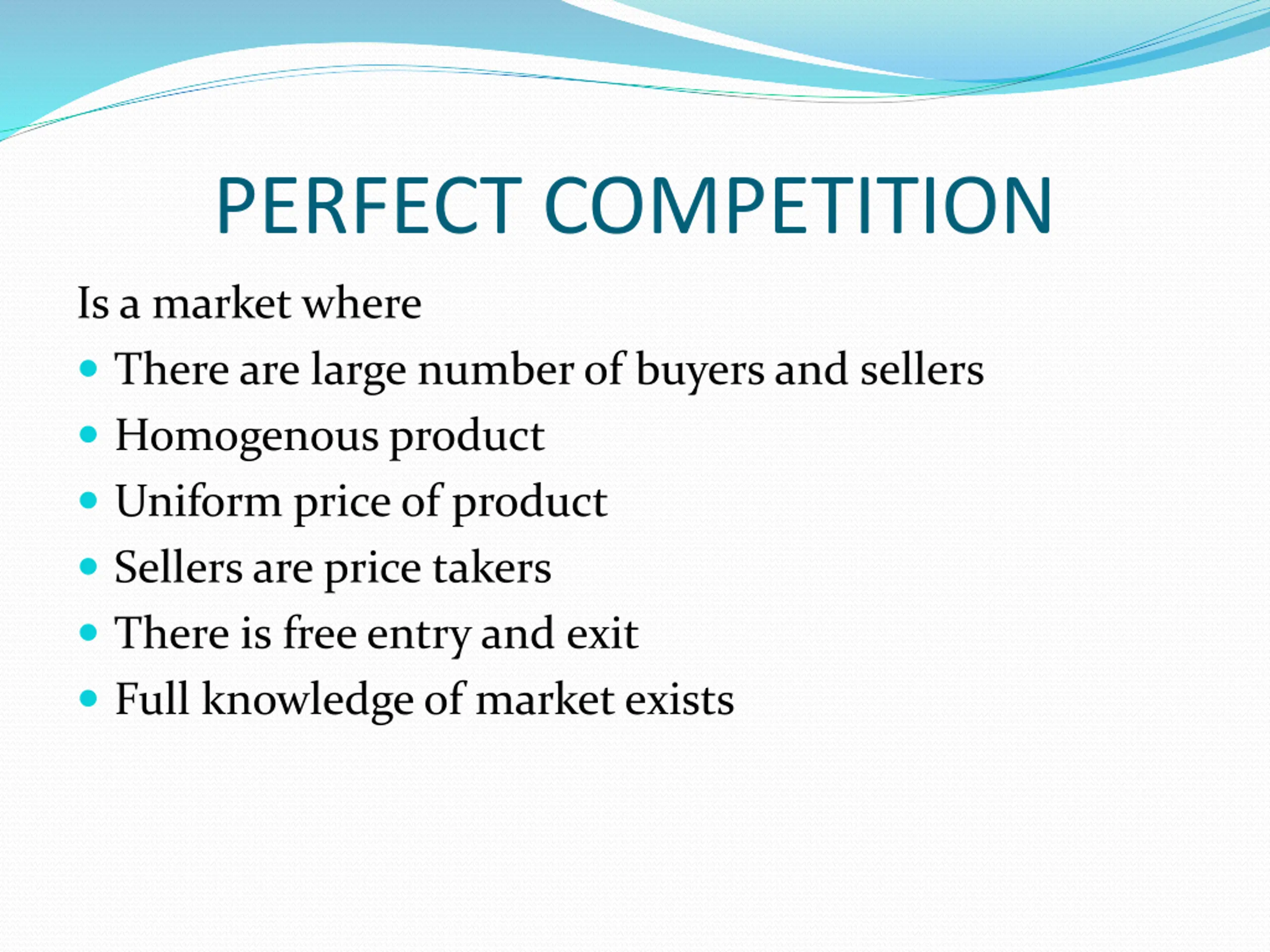 PERFECT COMPETITION Is a market where There are large number of buyers and sellers Homogenous product Uniform price of product Sellers are price takers There is free entry and exit Full knowledge of market exists
