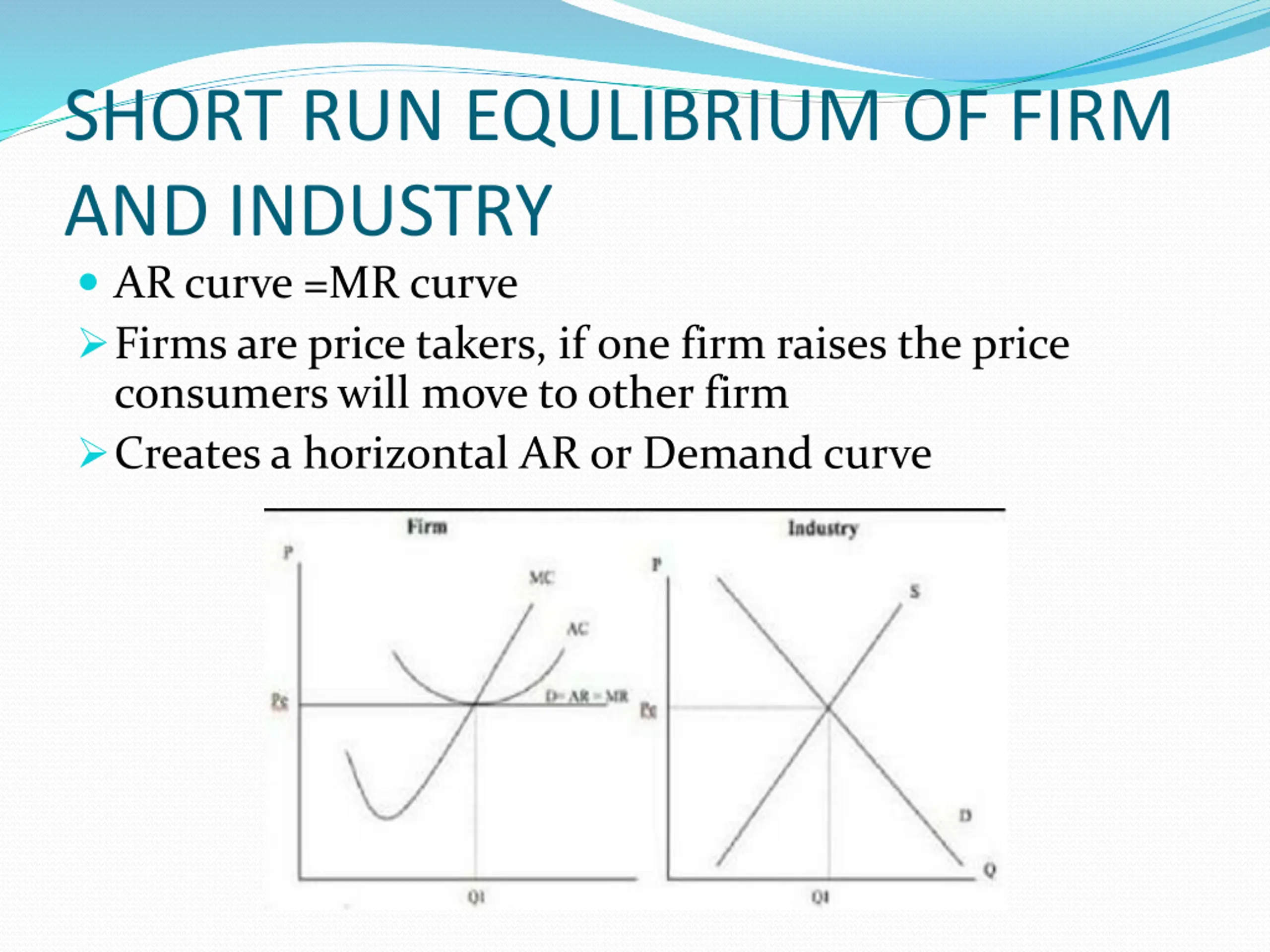 SHORT RUN EQULIBRIUM OF FIRM AND INDUSTRY AR curve =MR curve Firms are price takers, if one firm raises the price consumers will move to other firm Creates a horizontal AR or Demand curve