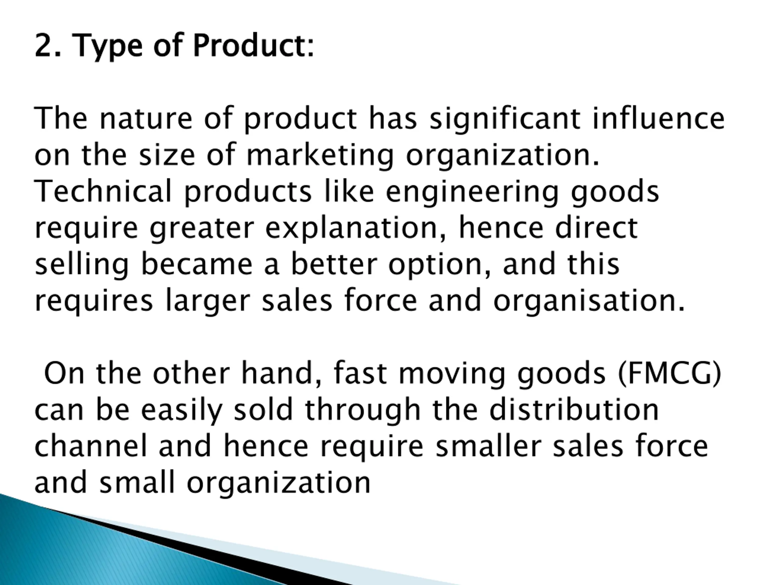 2. Type of Product 2. Type of Product: : The nature of product has significant influence on the size of marketing organization. Technical products like engineering goods require greater explanation, hence direct selling became a better option, and this requires larger sales force and organisation. On the other hand, fast moving goods (FMCG) can be easily sold through the distribution channel and hence require smaller sales force and small organization
