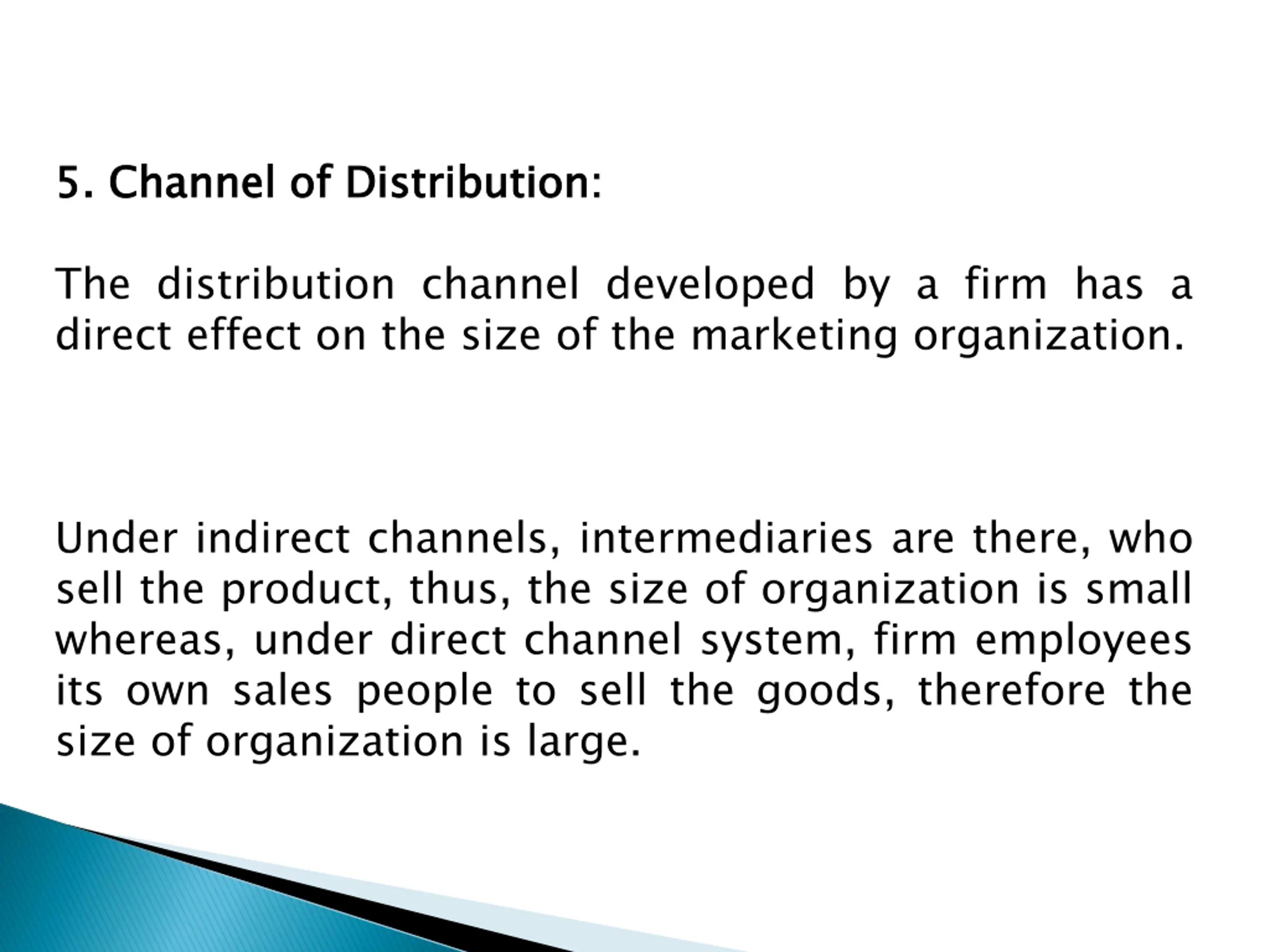 5 5. . Channel Channel of of Distribution Distribution: : The distribution channel developed by a firm has a direct effect on the size of the marketing organization. Under indirect channels, intermediaries are there, who sell the product, thus, the size of organization is small whereas, under direct channel system, firm employees its own sales people to sell the goods, therefore the size of organization is large.