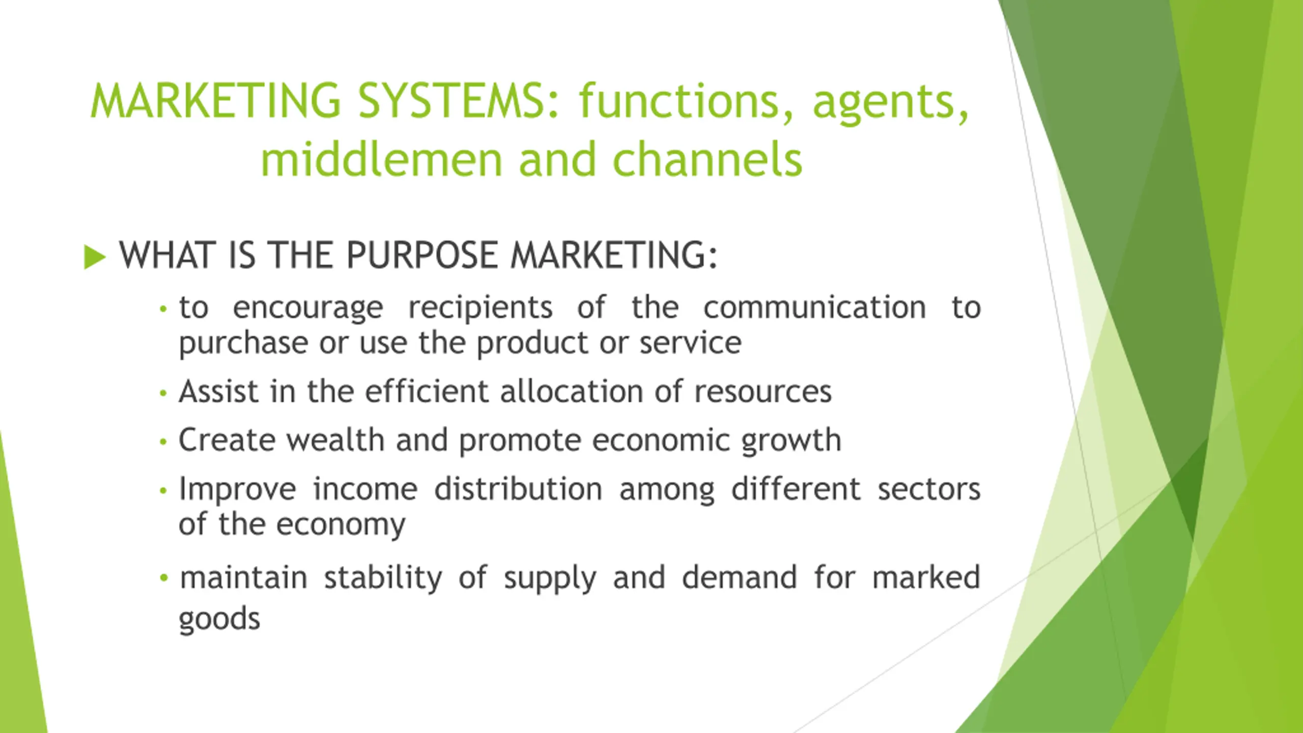 MARKETING SYSTEMS: functions, agents, middlemen and channels WHAT IS THE PURPOSE MARKETING: to encourage recipients of the communication to purchase or use the product or service Assist in the efficient allocation of resources Create wealth and promote economic growth Improve income distribution among different sectors of the economy maintain stability of supply and demand for marked goods