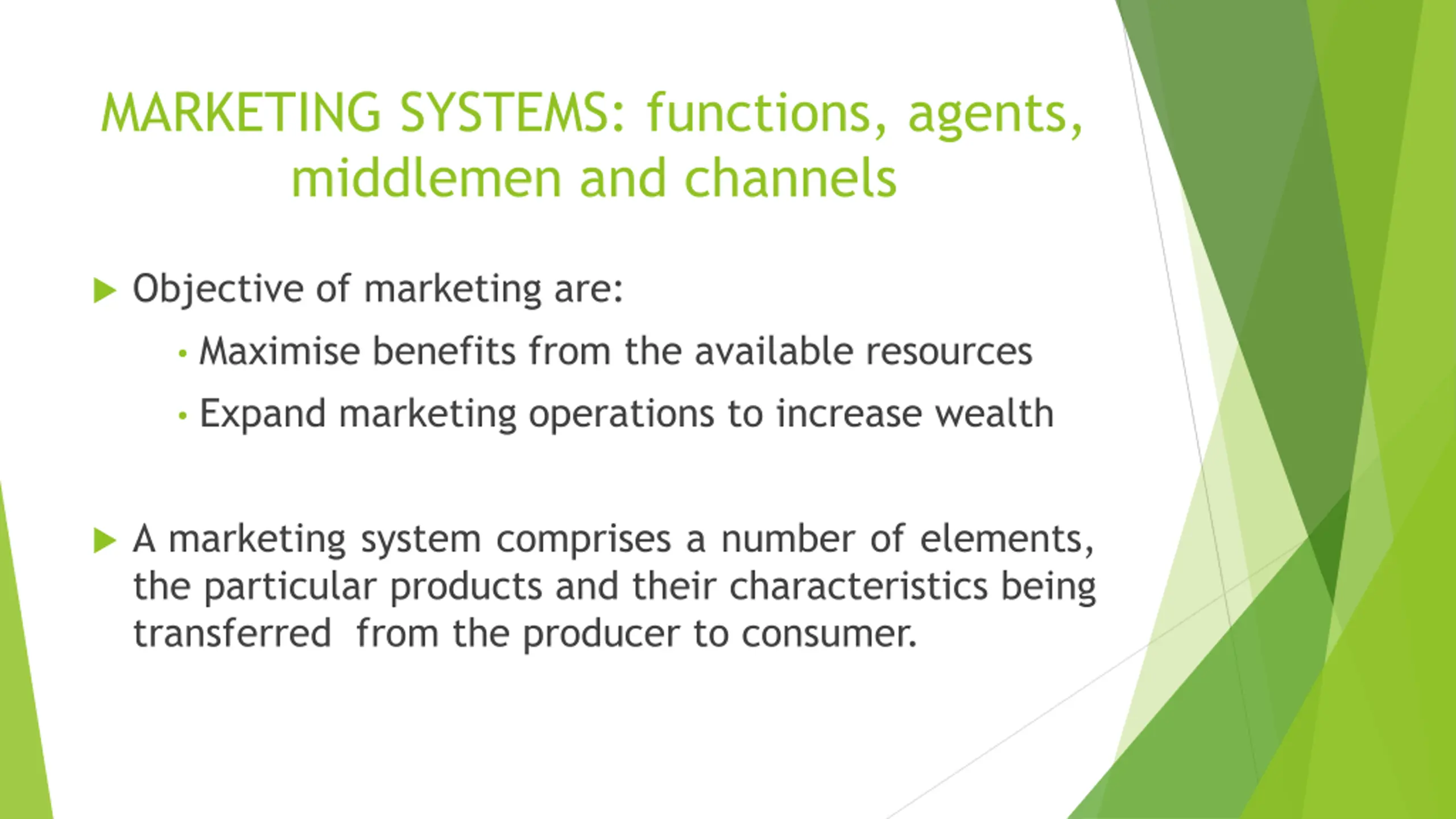 MARKETING SYSTEMS: functions, agents, middlemen and channels Objective of marketing are: Maximise benefits from the available resources Expand marketing operations to increase wealth A marketing system comprises a number of elements, the particular products and their characteristics being transferred from the producer to consumer.