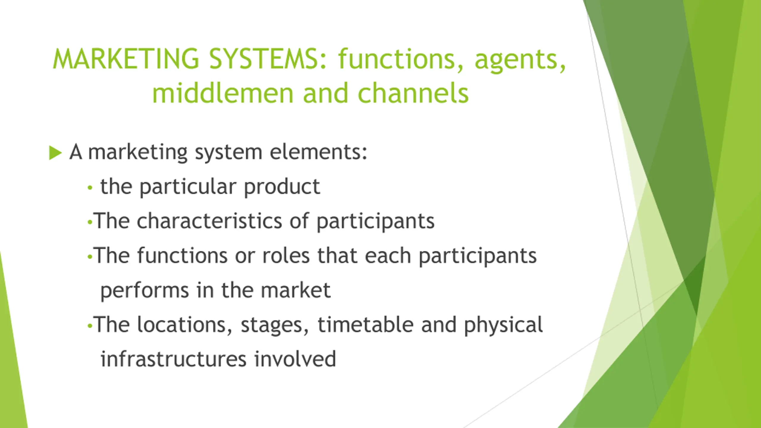 MARKETING SYSTEMS: functions, agents, middlemen and channels A marketing system elements: the particular product The characteristics of participants The functions or roles that each participants performs in the market The locations, stages, timetable and physical infrastructures involved