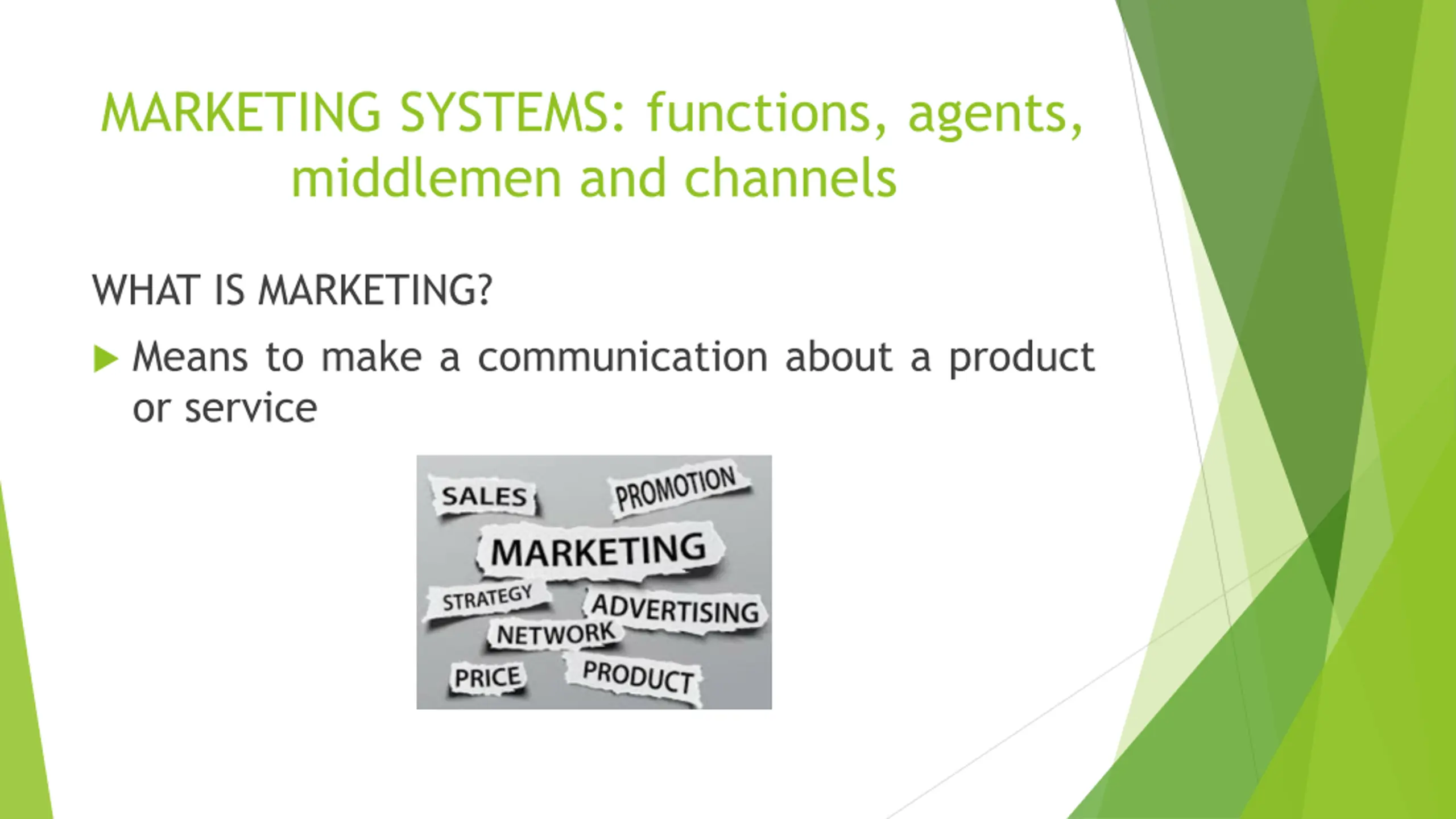 MARKETING SYSTEMS: functions, agents, middlemen and channels WHAT IS MARKETING? Means to make a communication about a product or service
