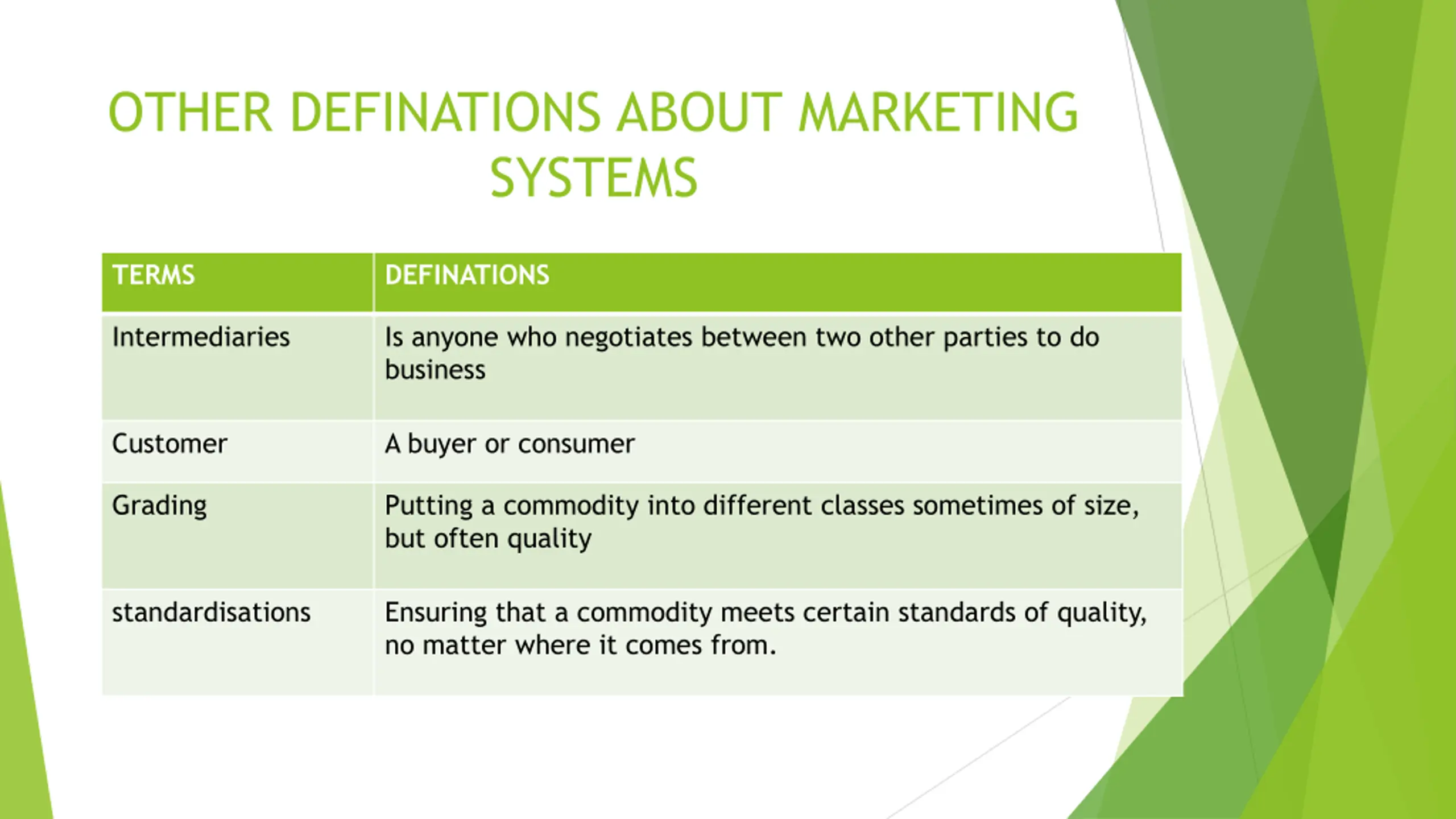 OTHER DEFINATIONS ABOUT MARKETING SYSTEMS TERMS DEFINATIONS Intermediaries Is anyone who negotiates between two other parties to do business Customer A buyer or consumer Grading Putting a commodity into different classes sometimes of size, but often quality standardisations Ensuring that a commodity meets certain standards of quality, no matter where it comes from.