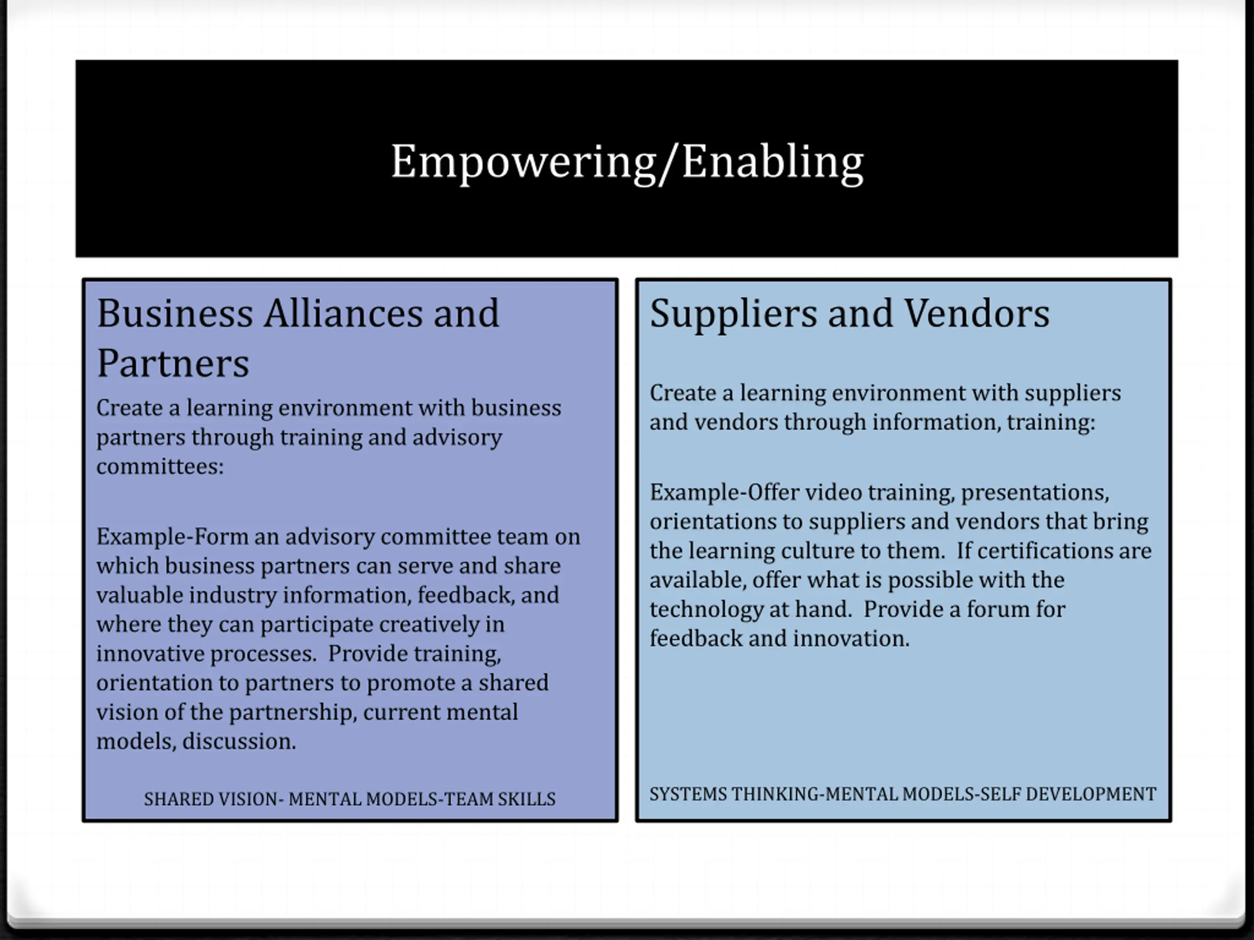 Empowering/Enabling Business Alliances and Partners Create a learning environment with business partners through training and advisory committees: Suppliers and Vendors Create a learning environment with suppliers and vendors through information, training: Example-Offer video training, presentations, orientations to suppliers and vendors that bring the learning culture to them. If certifications are available, offer what is possible with the technology at hand. Provide a forum for feedback and innovation. Example-Form an advisory committee team on which business partners can serve and share valuable industry information, feedback, and where they can participate creatively in innovative processes. Provide training, orientation to partners to promote a shared vision of the partnership, current mental models, discussion. SYSTEMS THINKING-MENTAL MODELS-SELF DEVELOPMENT SHARED VISION- MENTAL MODELS-TEAM SKILLS