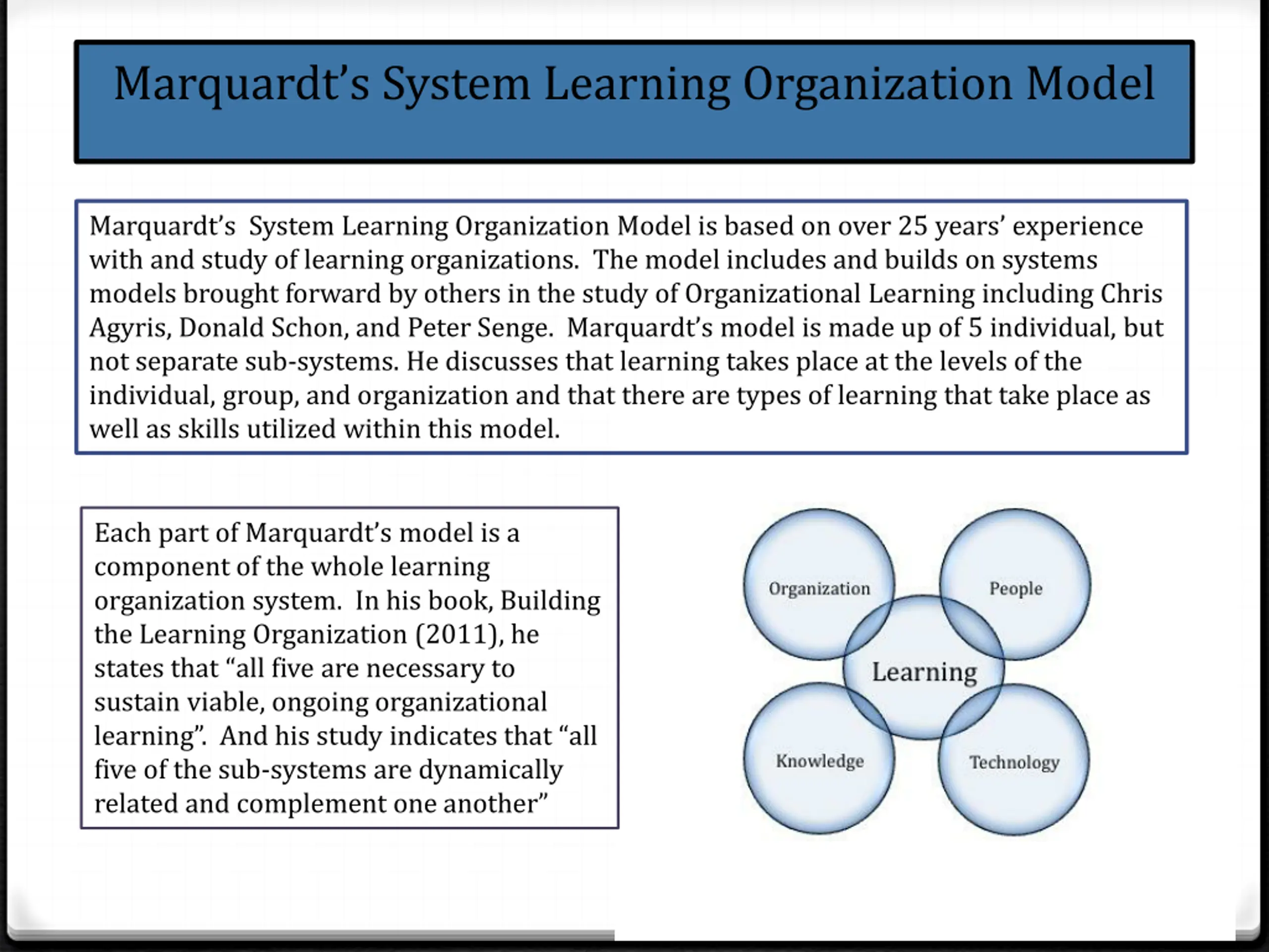 Marquardts System Learning Organization Model Marquardt s System Learning Organization Model is based on over 25 years experience with and study of learning organizations. The model includes and builds on systems models brought forward by others in the study of Organizational Learning including Chris Agyris, Donald Schon, and Peter Senge. Marquardt s model is made up of 5 individual, but not separate sub-systems. He discusses that learning takes place at the levels of the individual, group, and organization and that there are types of learning that take place as well as skills utilized within this model. Each part of Marquardt s model is a component of the whole learning organization system. In his book, Building the Learning Organization (2011), he states that all five are necessary to sustain viable, ongoing organizational learning . And his study indicates that all five of the sub-systems are dynamically related and complement one another