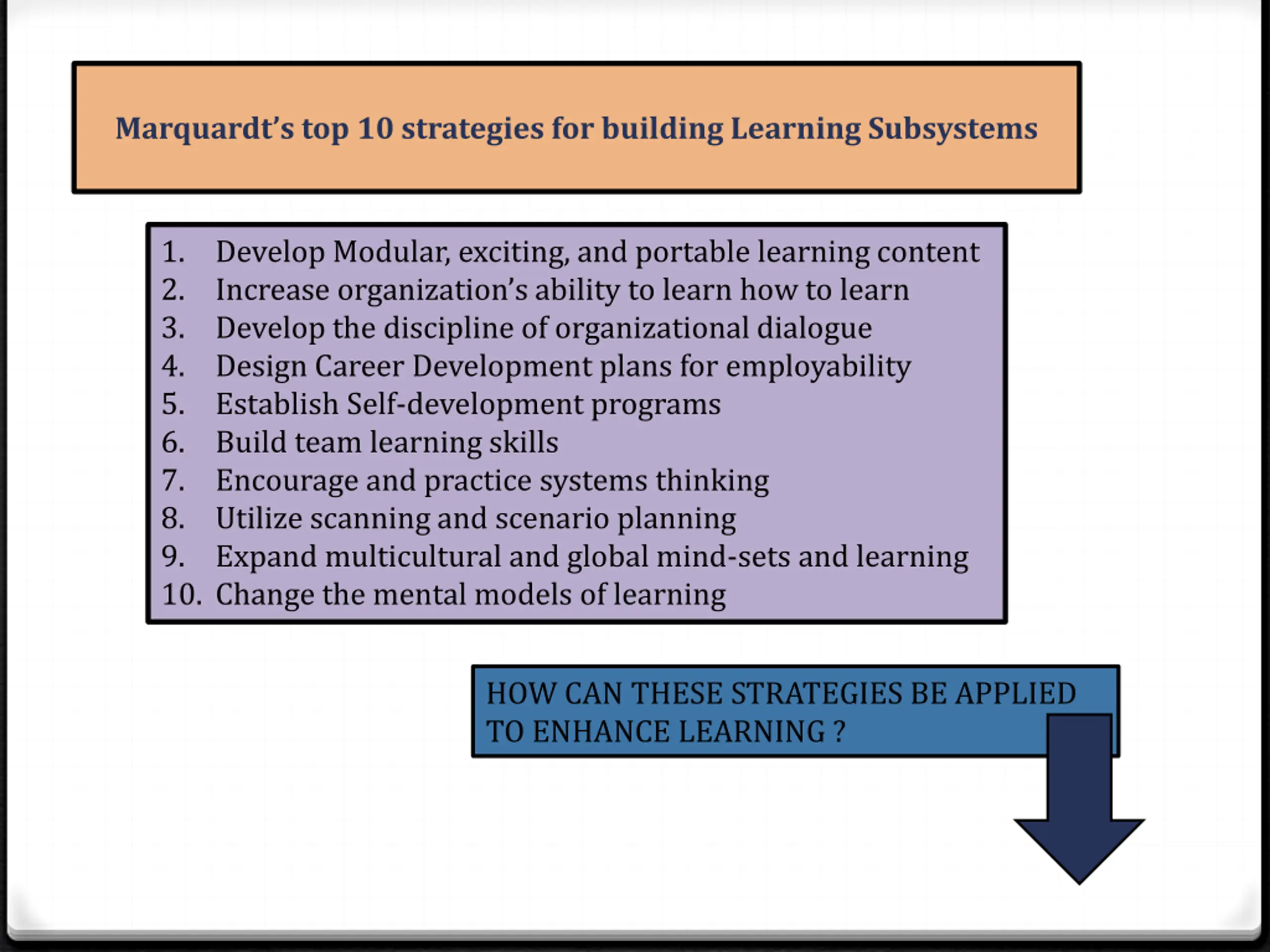 Marquardts top 10 strategies for building Learning Subsystems 1. Develop Modular, exciting, and portable learning content 2. Increase organization s ability to learn how to learn 3. Develop the discipline of organizational dialogue 4. Design Career Development plans for employability 5. Establish Self-development programs 6. Build team learning skills 7. Encourage and practice systems thinking 8. Utilize scanning and scenario planning 9. Expand multicultural and global mind-sets and learning 10. Change the mental models of learning HOW CAN THESE STRATEGIES BE APPLIED TO ENHANCE LEARNING ?