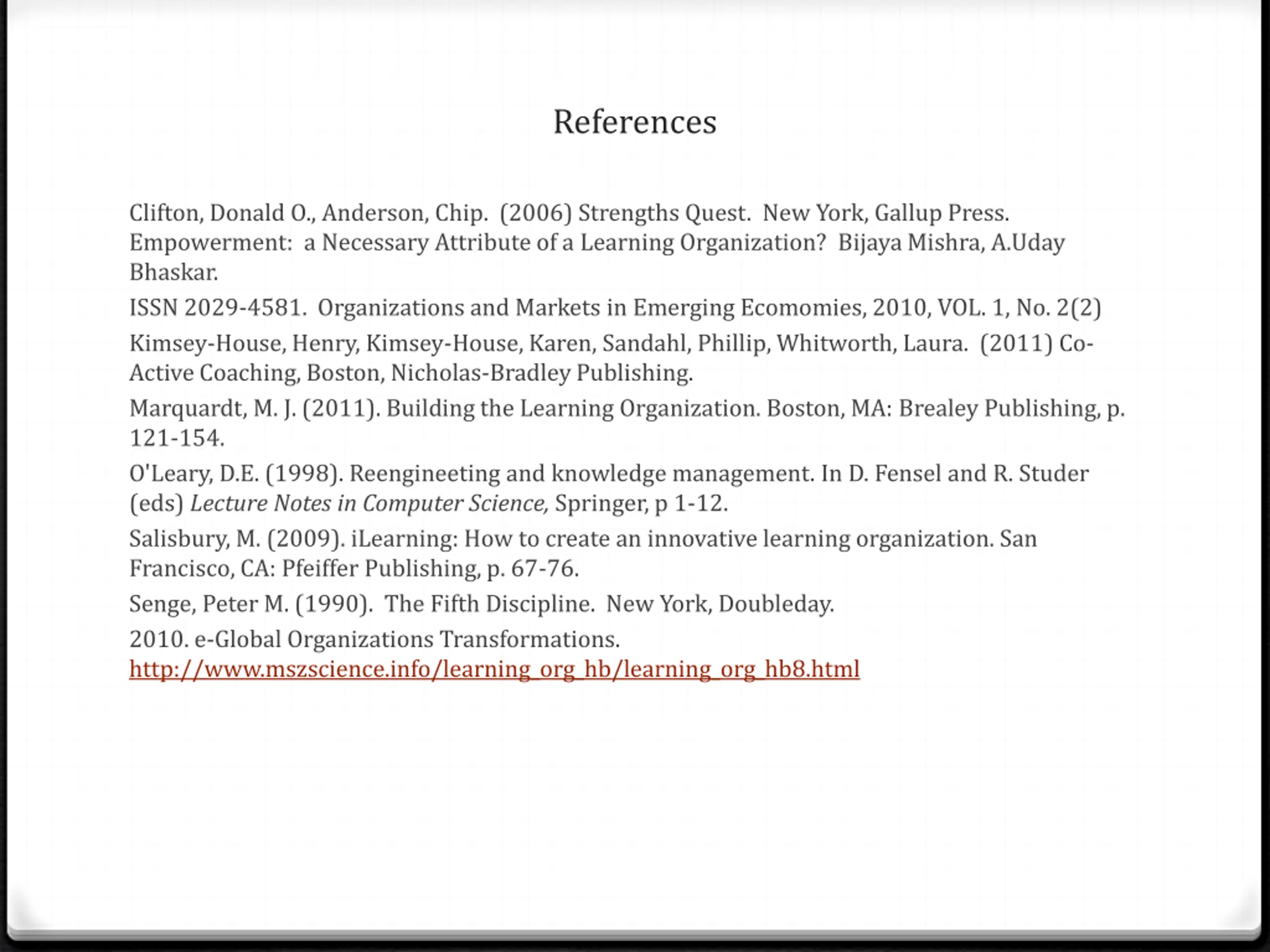 References Clifton, Donald O., Anderson, Chip. (2006) Strengths Quest. New York, Gallup Press. Empowerment: a Necessary Attribute of a Learning Organization? Bijaya Mishra, A.Uday Bhaskar. ISSN 2029-4581. Organizations and Markets in Emerging Ecomomies, 2010, VOL. 1, No. 2(2) Kimsey-House, Henry, Kimsey-House, Karen, Sandahl, Phillip, Whitworth, Laura. (2011) Co- Active Coaching, Boston, Nicholas-Bradley Publishing. Marquardt, M. J. (2011). Building the Learning Organization. Boston, MA: Brealey Publishing, p. 121-154. O'Leary, D.E. (1998). Reengineeting and knowledge management. In D. Fensel and R. Studer (eds) Lecture Notes in Computer Science, Springer, p 1-12. Salisbury, M. (2009). iLearning: How to create an innovative learning organization. San Francisco, CA: Pfeiffer Publishing, p. 67-76. Senge, Peter M. (1990). The Fifth Discipline. New York, Doubleday. 2010. e-Global Organizations Transformations. http://www.mszscience.info/learning_org_hb/learning_org_hb8.html
