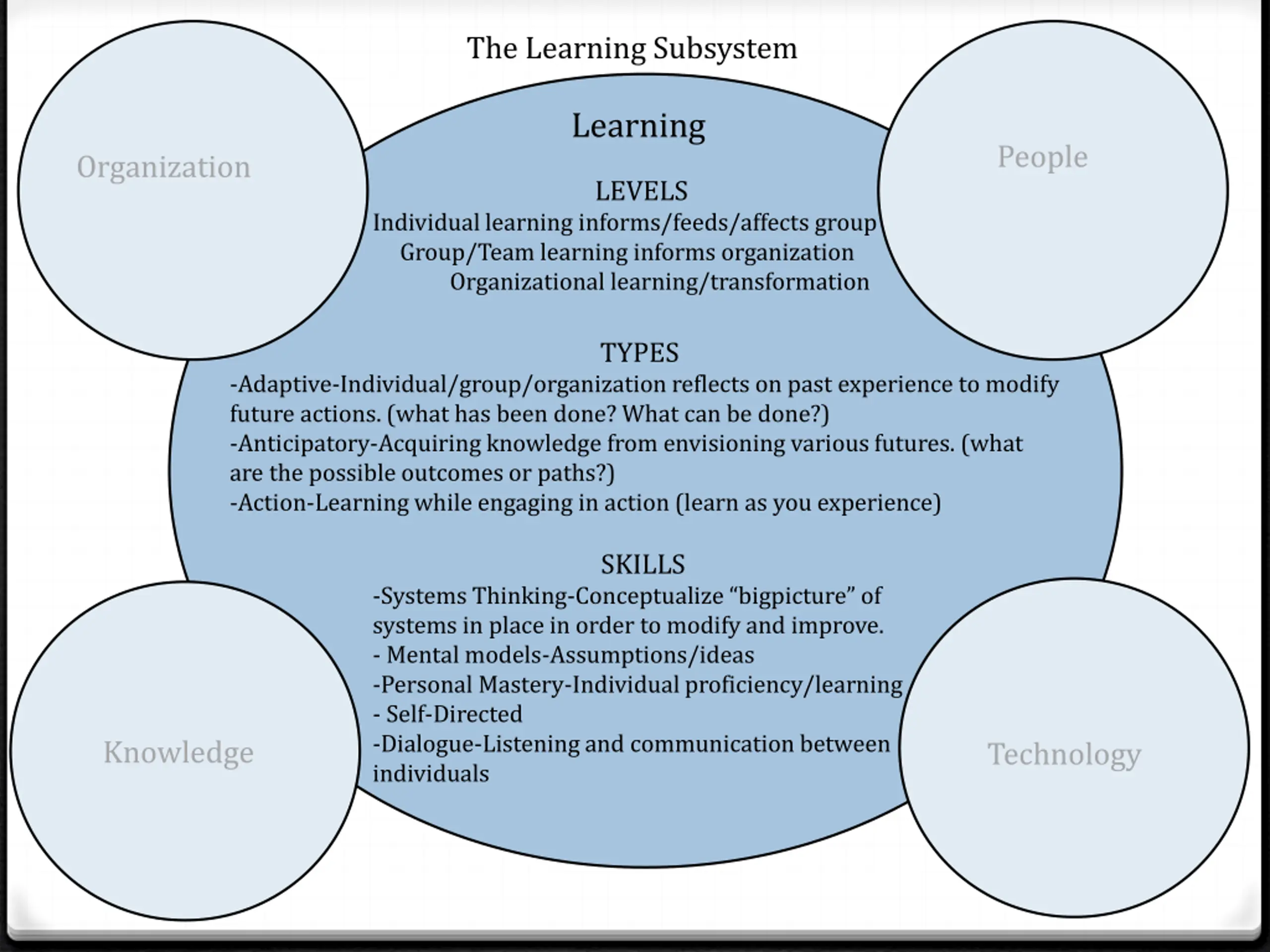 The Learning Subsystem Learning People Organization LEVELS Individual learning informs/feeds/affects group Group/Team learning informs organization Organizational learning/transformation TYPES -Adaptive-Individual/group/organization reflects on past experience to modify future actions. (what has been done? What can be done?) -Anticipatory-Acquiring knowledge from envisioning various futures. (what are the possible outcomes or paths?) -Action-Learning while engaging in action (learn as you experience) SKILLS -Systems Thinking-Conceptualize bigpicture of systems in place in order to modify and improve. - Mental models-Assumptions/ideas -Personal Mastery-Individual proficiency/learning - Self-Directed -Dialogue-Listening and communication between individuals Knowledge Technology