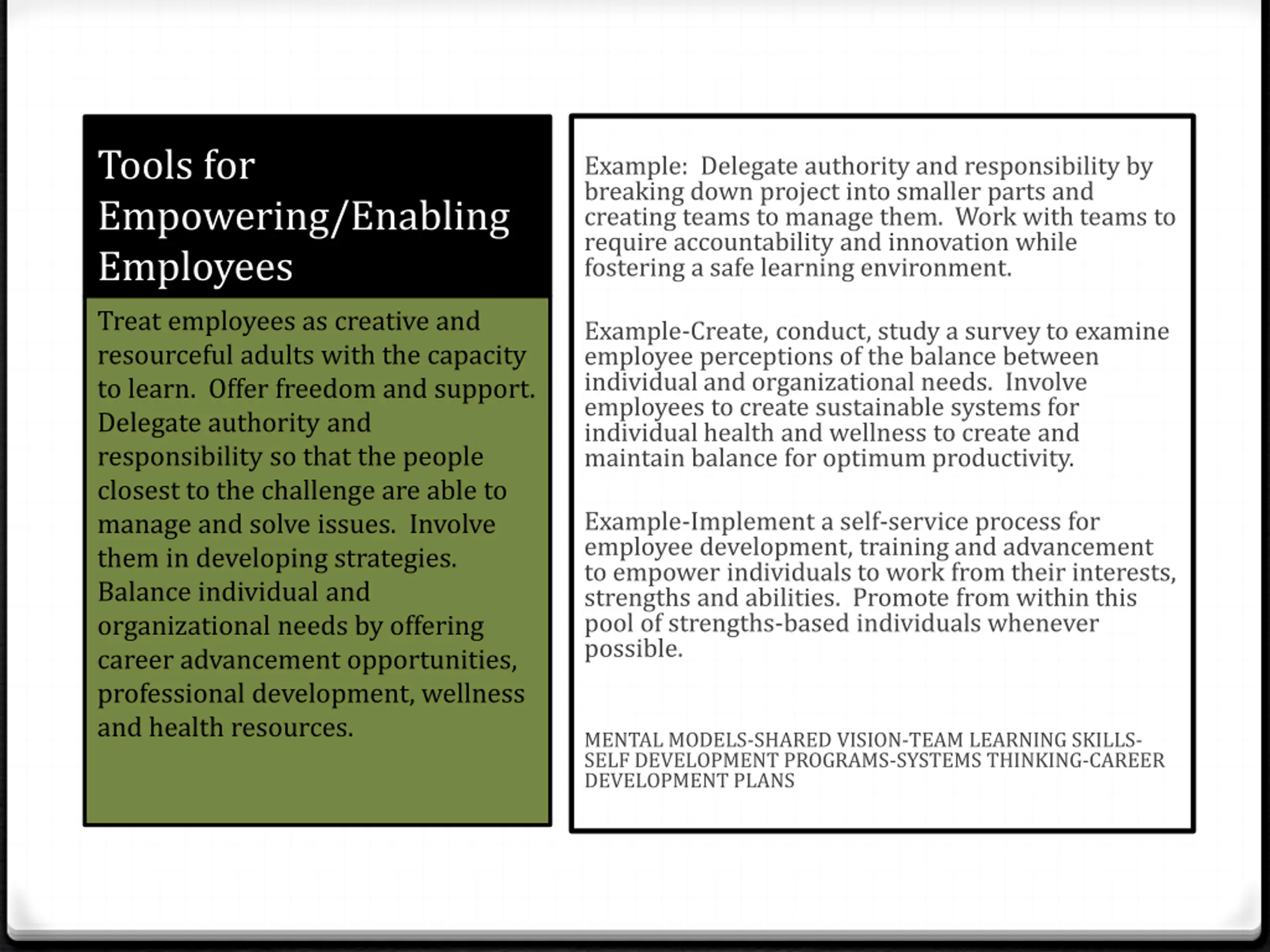 Tools for Empowering/Enabling Employees Treat employees as creative and resourceful adults with the capacity to learn. Offer freedom and support. Delegate authority and responsibility so that the people closest to the challenge are able to manage and solve issues. Involve them in developing strategies. Balance individual and organizational needs by offering career advancement opportunities, professional development, wellness and health resources. Example: Delegate authority and responsibility by breaking down project into smaller parts and creating teams to manage them. Work with teams to require accountability and innovation while fostering a safe learning environment. Example-Create, conduct, study a survey to examine employee perceptions of the balance between individual and organizational needs. Involve employees to create sustainable systems for individual health and wellness to create and maintain balance for optimum productivity. Example-Implement a self-service process for employee development, training and advancement to empower individuals to work from their interests, strengths and abilities. Promote from within this pool of strengths-based individuals whenever possible. MENTAL MODELS-SHARED VISION-TEAM LEARNING SKILLS- SELF DEVELOPMENT PROGRAMS-SYSTEMS THINKING-CAREER DEVELOPMENT PLANS