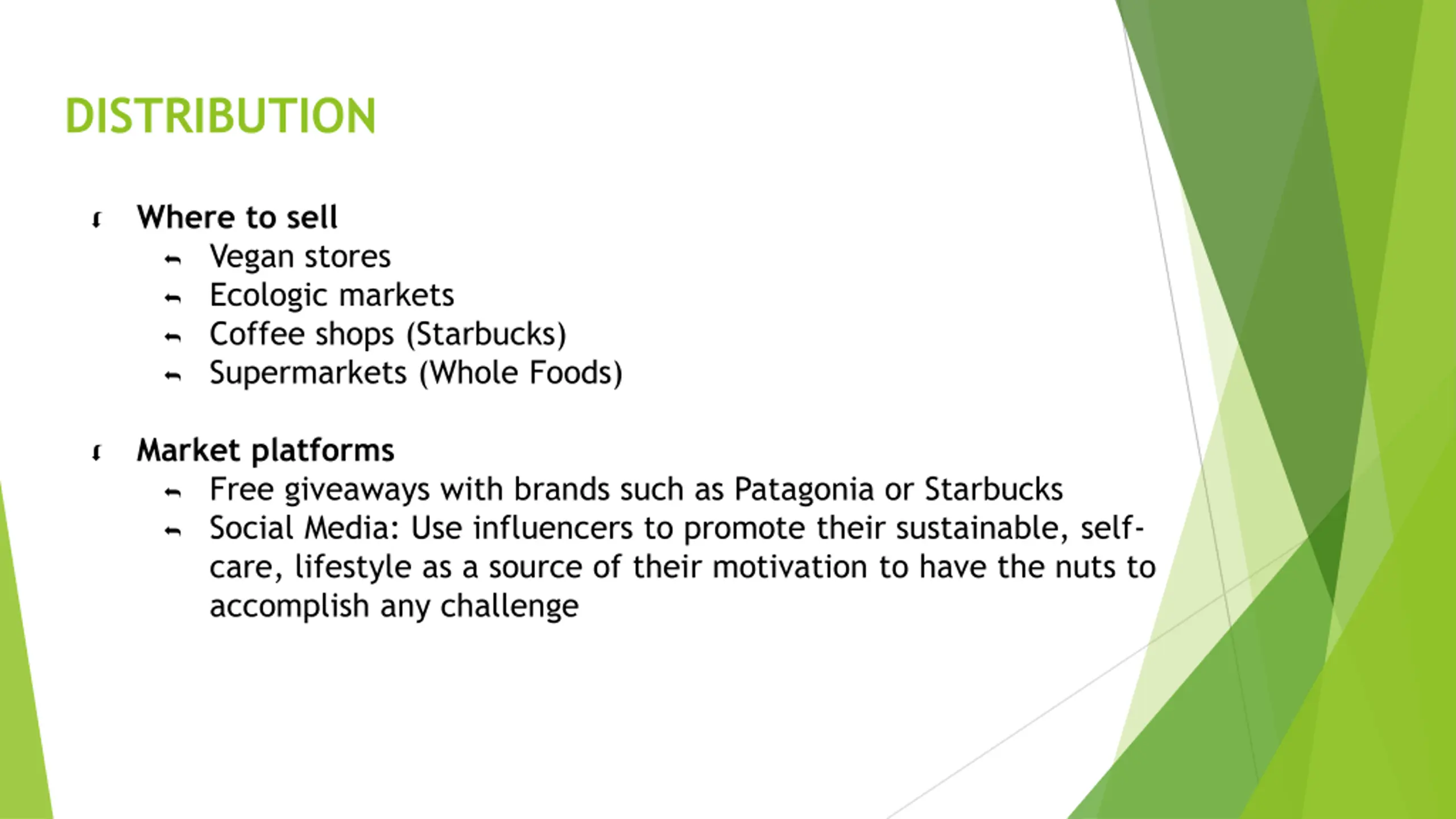 DISTRIBUTION Where to sell Vegan stores Ecologic markets Coffee shops (Starbucks) Supermarkets (Whole Foods) Market platforms Free giveaways with brands such as Patagonia or Starbucks Social Media: Use influencers to promote their sustainable, self- care, lifestyle as a source of their motivation to have the nuts to accomplish any challenge