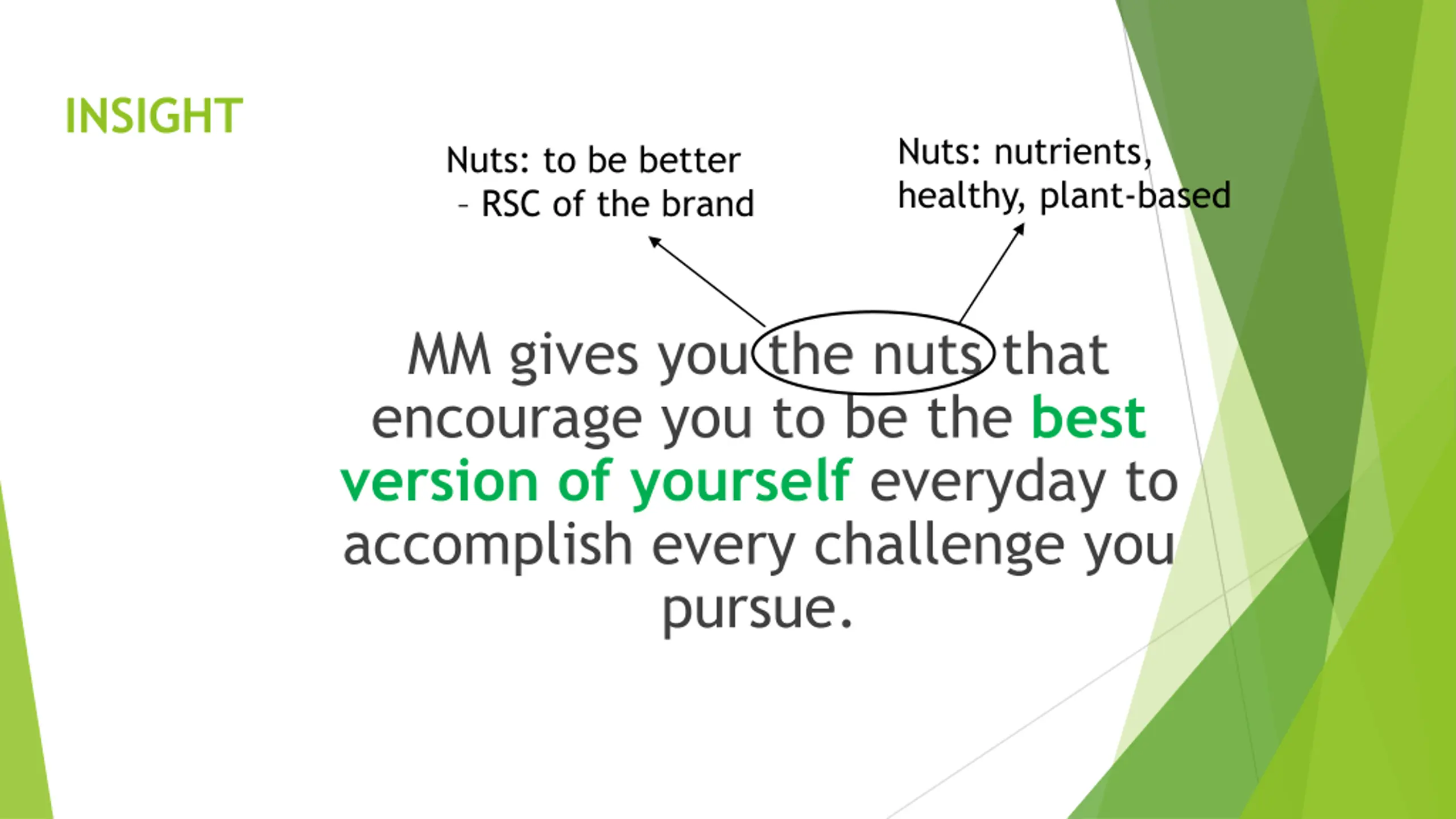INSIGHT Nuts: nutrients, healthy, plant-based Nuts: to be better RSC of the brand MM gives you the nuts that encourage you to be the best version of yourself everyday to accomplish every challenge you pursue.