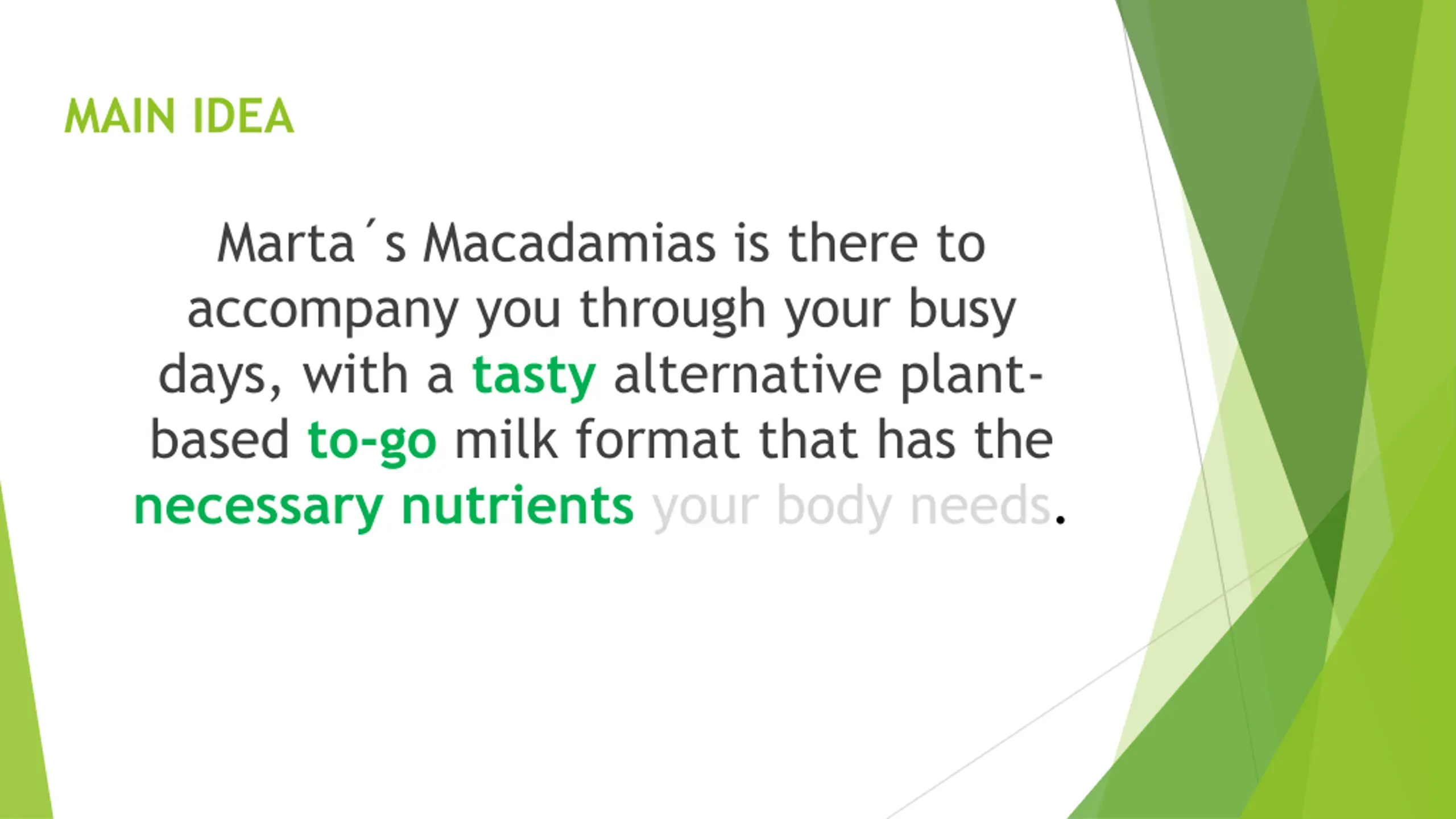 MAIN IDEA Marta s Macadamias is there to accompany you through your busy days, with a tasty alternative plant- based to-go milk format that has the necessary nutrients your body needs.