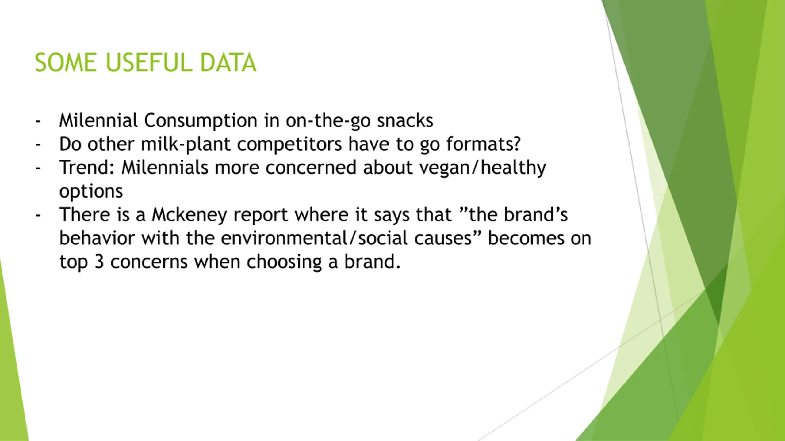 SOME USEFUL DATA - Milennial Consumption in on-the-go snacks - Do other milk-plant competitors have to go formats? - Trend: Milennials more concerned about vegan/healthy options - There is a Mckeney report where it says that the brand s behavior with the environmental/social causes becomes on top 3 concerns when choosing a brand.
