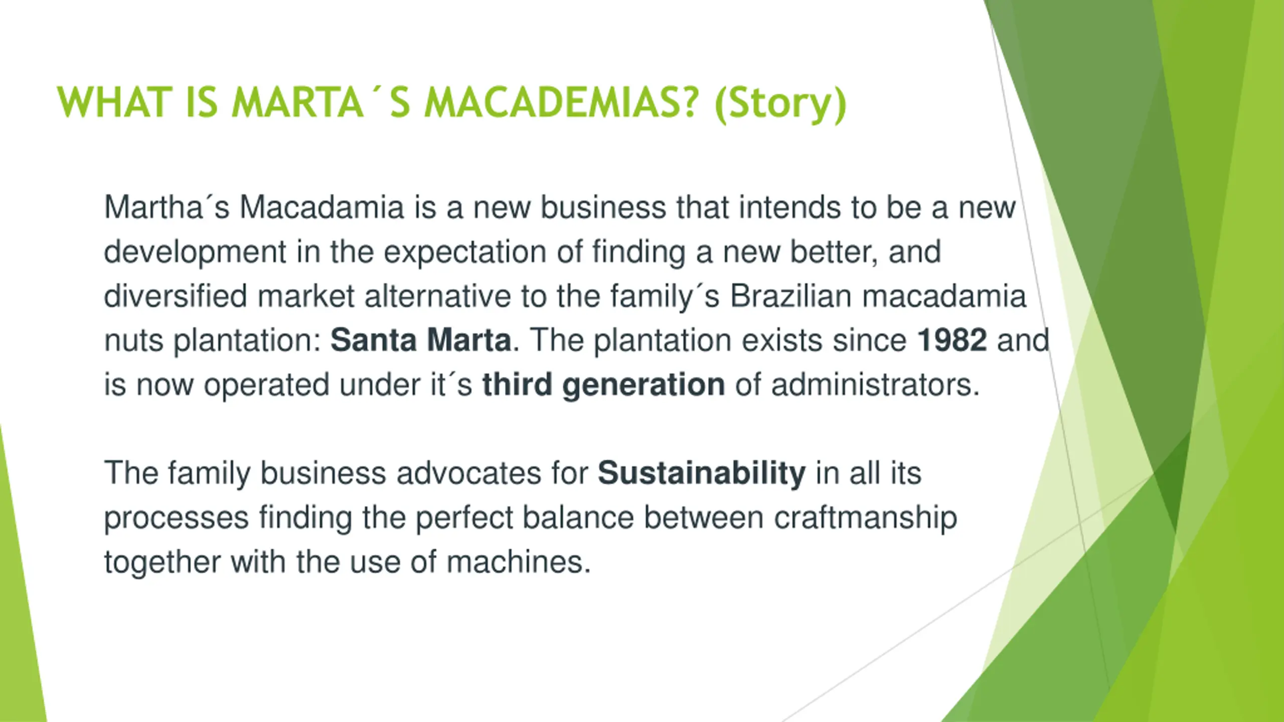 WHAT IS MARTAS MACADEMIAS? (Story) Martha s Macadamia is a new business that intends to be a new development in the expectation of finding a new better, and diversified market alternative to the family s Brazilian macadamia nuts plantation: Santa Marta. The plantation exists since 1982 and is now operated under it s third generation of administrators. The family business advocates for Sustainability in all its processes finding the perfect balance between craftmanship together with the use of machines.