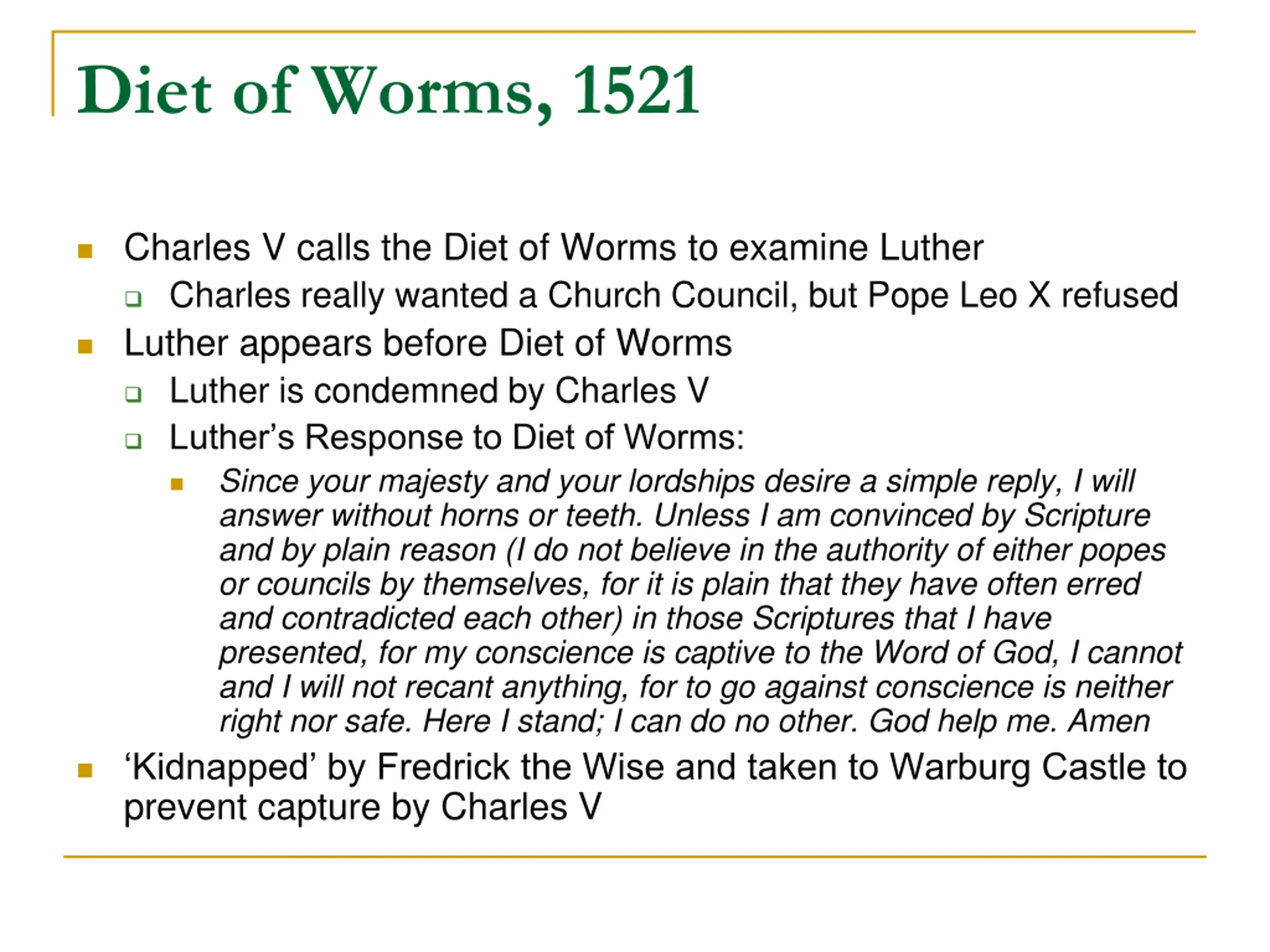 Diet of Worms, 1521 Charles V calls the Diet of Worms to examine Luther Charles really wanted a Church Council, but Pope Leo X refused Luther appears before Diet of Worms Luther is condemned by Charles V Luther s Response to Diet of Worms: Since your majesty and your lordships desire a simple reply, I will answer without horns or teeth. Unless I am convinced by Scripture and by plain reason (I do not believe in the authority of either popes or councils by themselves, for it is plain that they have often erred and contradicted each other) in those Scriptures that I have presented, for my conscience is captive to the Word of God, I cannot and I will not recant anything, for to go against conscience is neither right nor safe. Here I stand; I can do no other. God help me. Amen Kidnapped by Fredrick the Wise and taken to Warburg Castle to prevent capture by Charles V