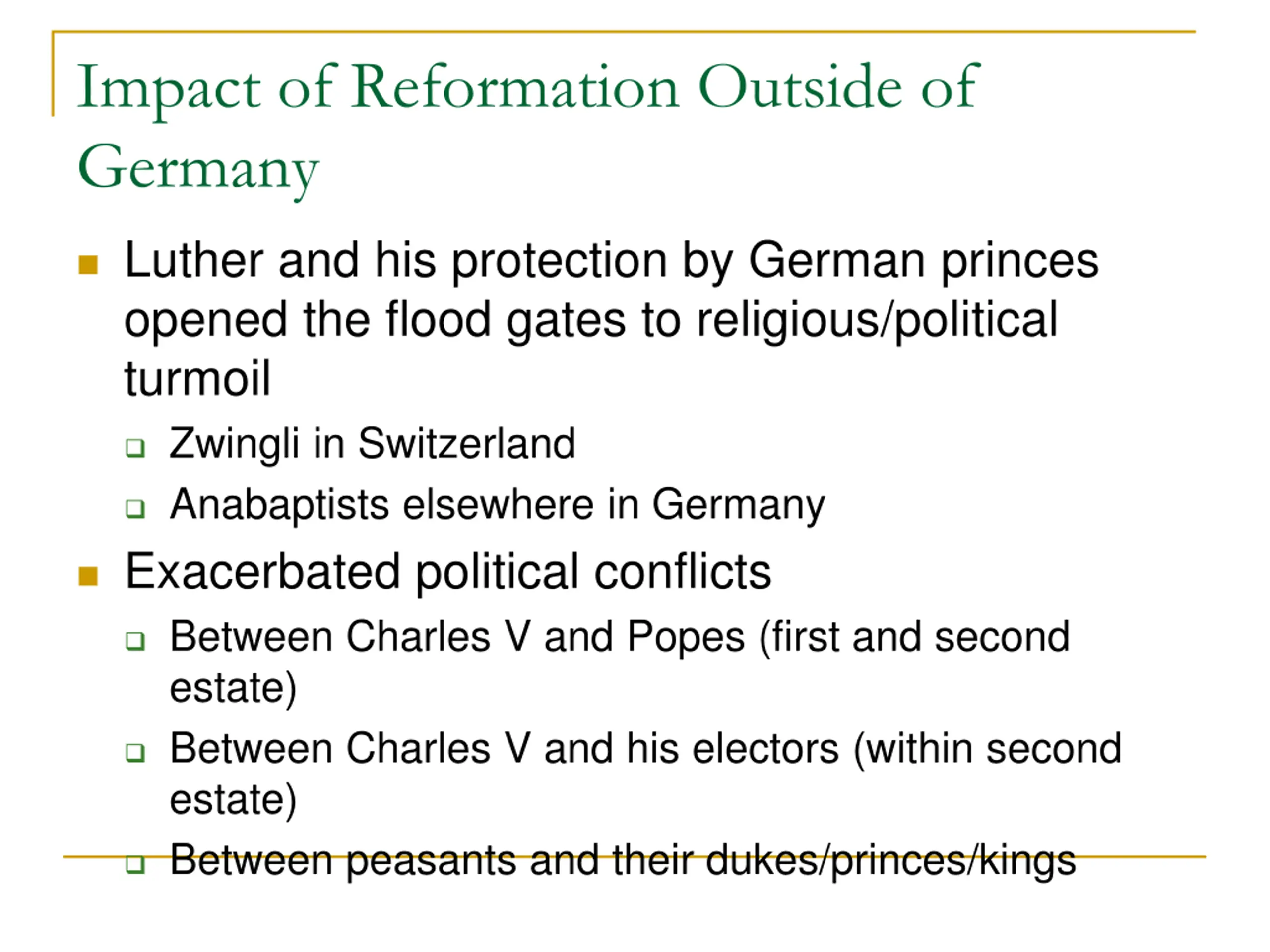 Impact of Reformation Outside of Germany Luther and his protection by German princes opened the flood gates to religious/political turmoil Zwingli in Switzerland Anabaptists elsewhere in Germany Exacerbated political conflicts Between Charles V and Popes (first and second estate) Between Charles V and his electors (within second estate) Between peasants and their dukes/princes/kings