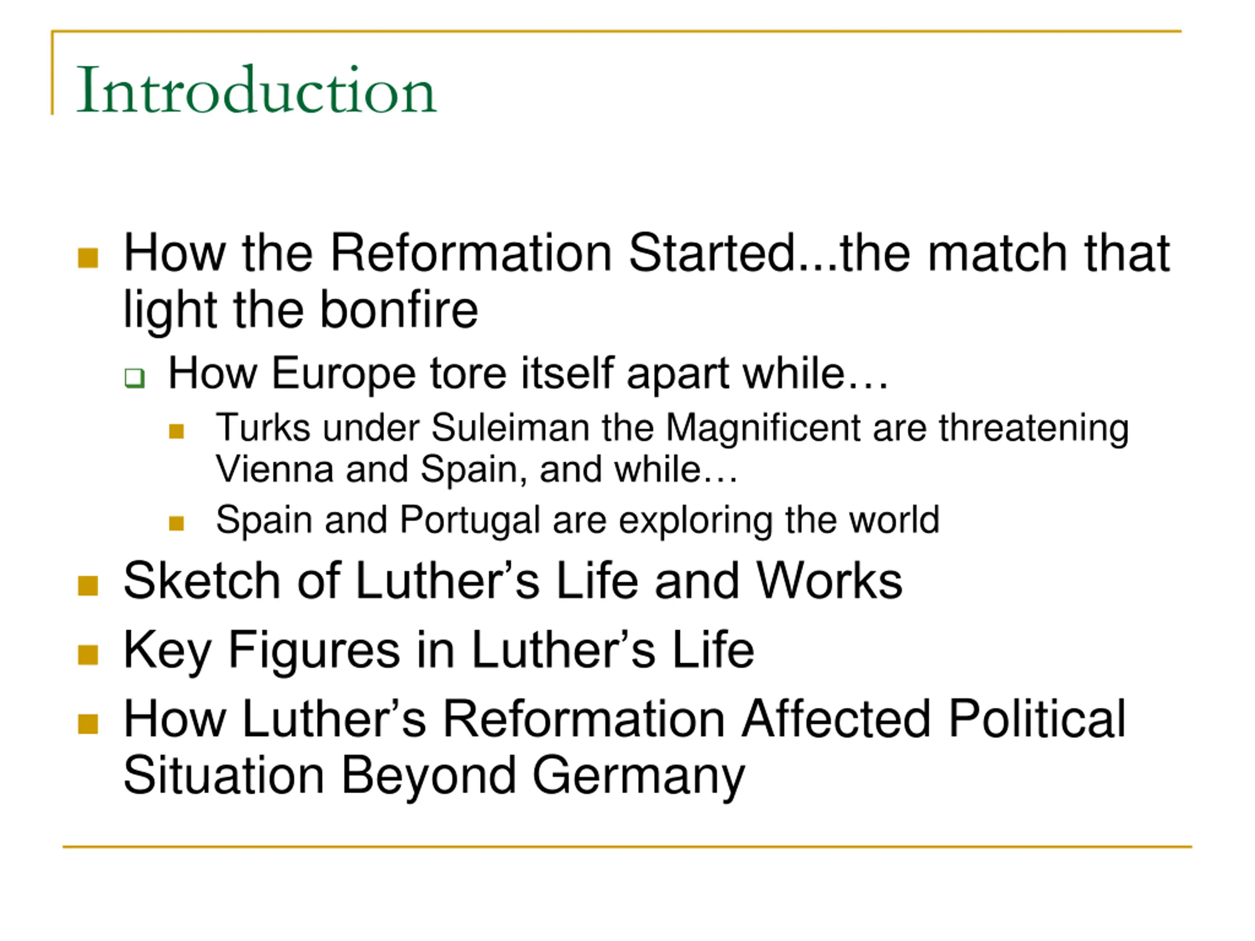Introduction How the Reformation Started...the match that light the bonfire How Europe tore itself apart while Turks under Suleiman the Magnificent are threatening Vienna and Spain, and while Spain and Portugal are exploring the world Sketch of Luther s Life and Works Key Figures in Luther s Life How Luther s Reformation Affected Political Situation Beyond Germany