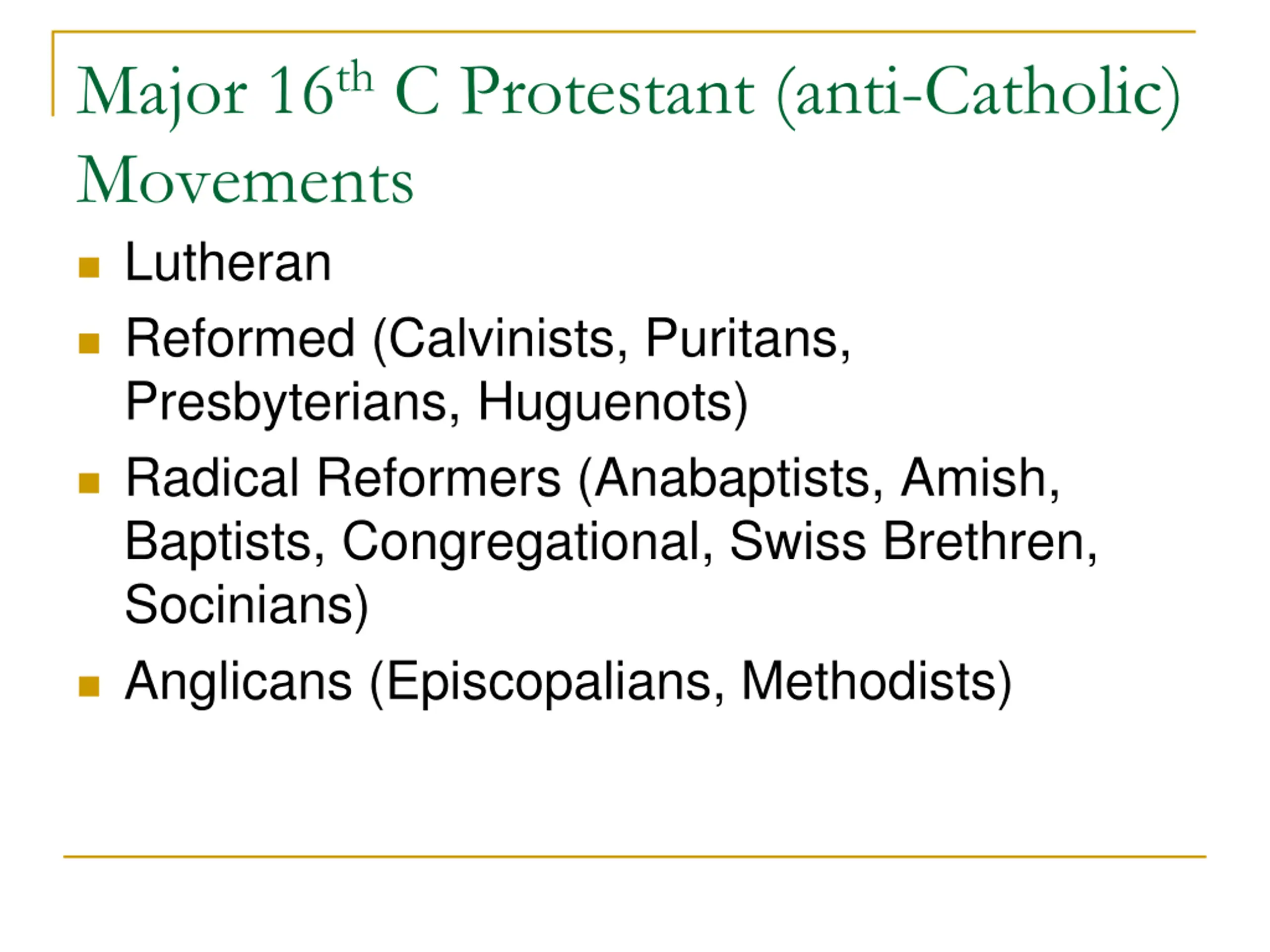 Major 16thC Protestant (anti-Catholic) Movements Lutheran Reformed (Calvinists, Puritans, Presbyterians, Huguenots) Radical Reformers (Anabaptists, Amish, Baptists, Congregational, Swiss Brethren, Socinians) Anglicans (Episcopalians, Methodists)