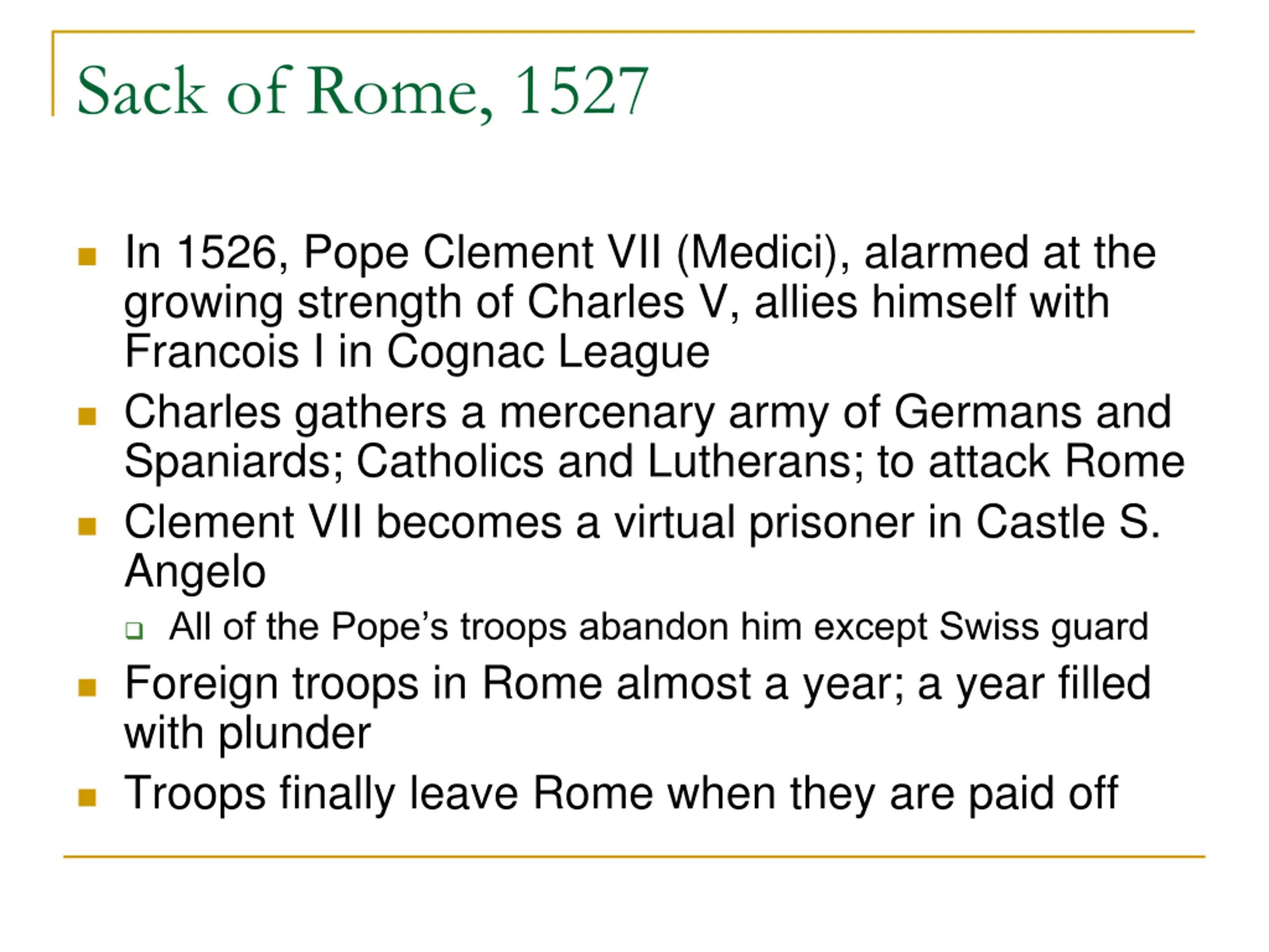 Sack of Rome, 1527 In 1526, Pope Clement VII (Medici), alarmed at the growing strength of Charles V, allies himself with Francois I in Cognac League Charles gathers a mercenary army of Germans and Spaniards; Catholics and Lutherans; to attack Rome Clement VII becomes a virtual prisoner in Castle S. Angelo All of the Pope s troops abandon him except Swiss guard Foreign troops in Rome almost a year; a year filled with plunder Troops finally leave Rome when they are paid off