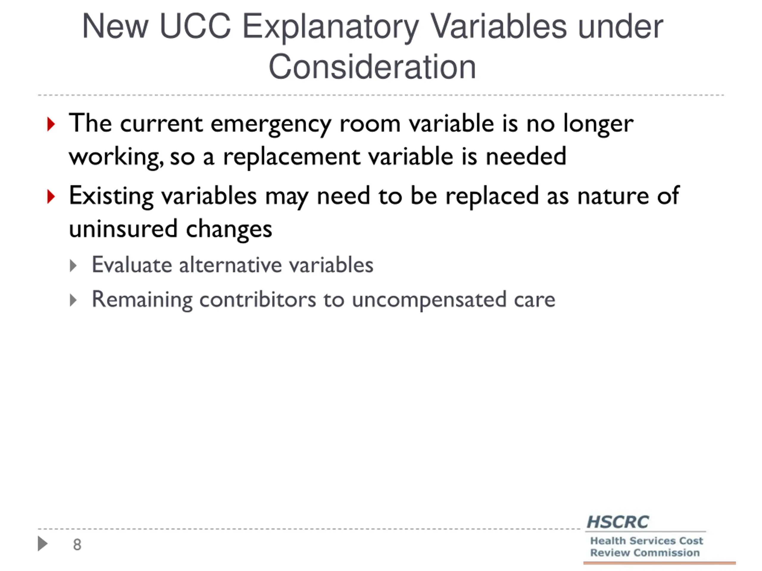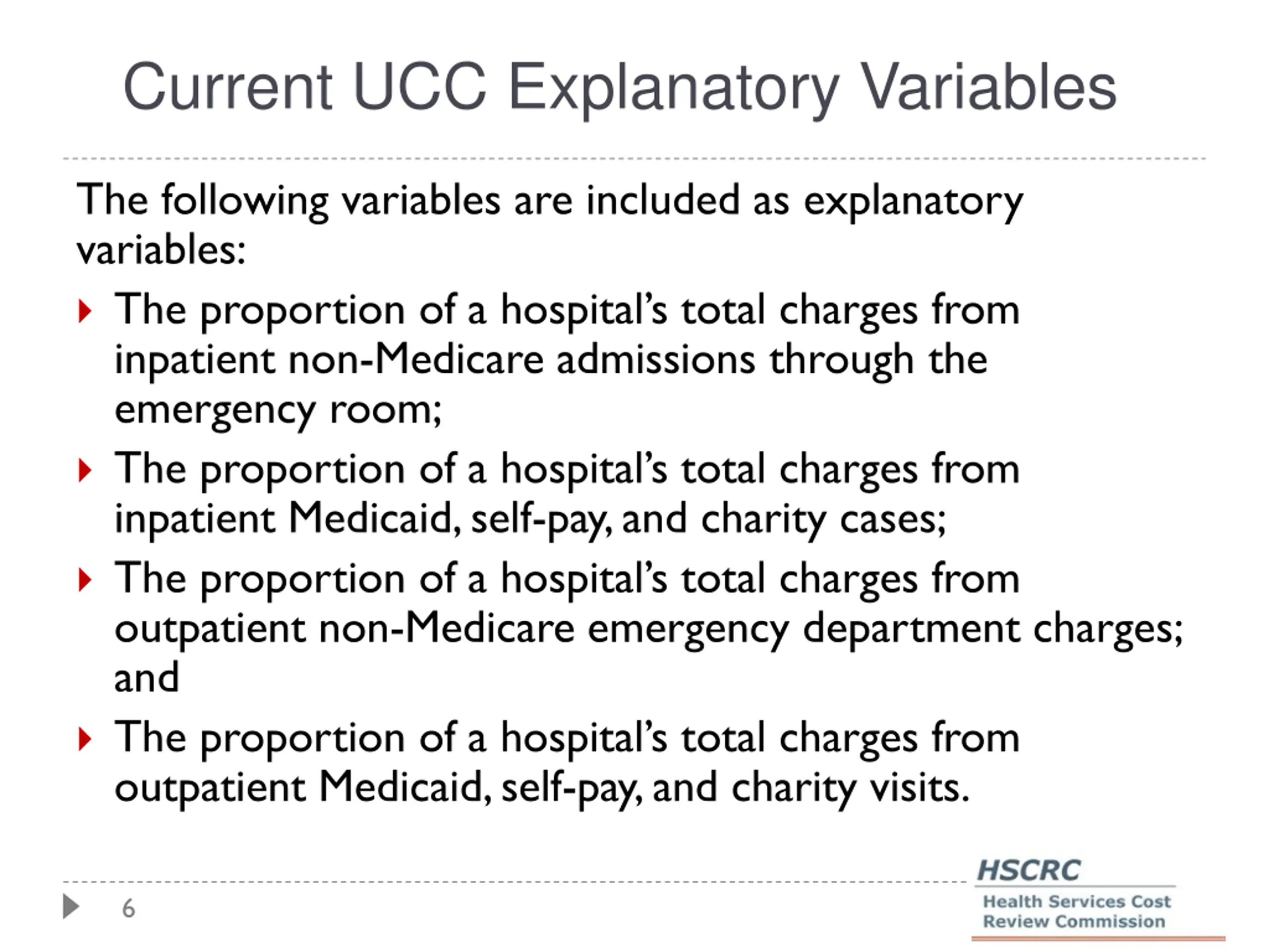 Current UCC Explanatory Variables The following variables are included as explanatory variables: The proportion of a hospital s total charges from inpatient non-Medicare admissions through the emergency room; The proportion of a hospital s total charges from inpatient Medicaid, self-pay, and charity cases; The proportion of a hospital s total charges from outpatient non-Medicare emergency department charges; and The proportion of a hospital s total charges from outpatient Medicaid, self-pay, and charity visits. 6