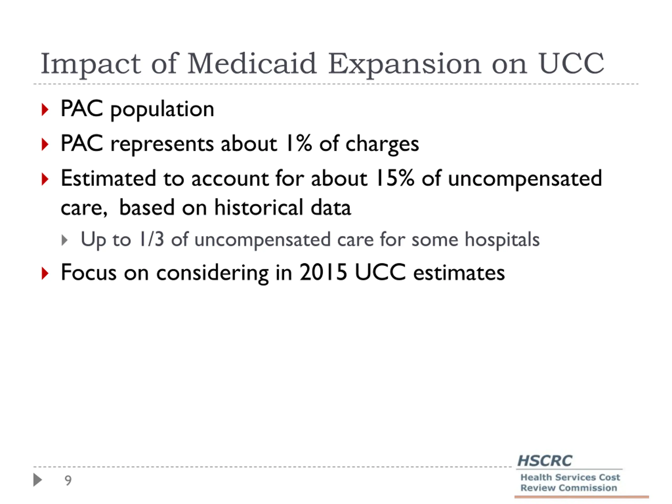 Impact of Medicaid Expansion on UCC PAC population PAC represents about 1% of charges Estimated to account for about 15% of uncompensated care, based on historical data Up to 1/3 of uncompensated care for some hospitals Focus on considering in 2015 UCC estimates 9