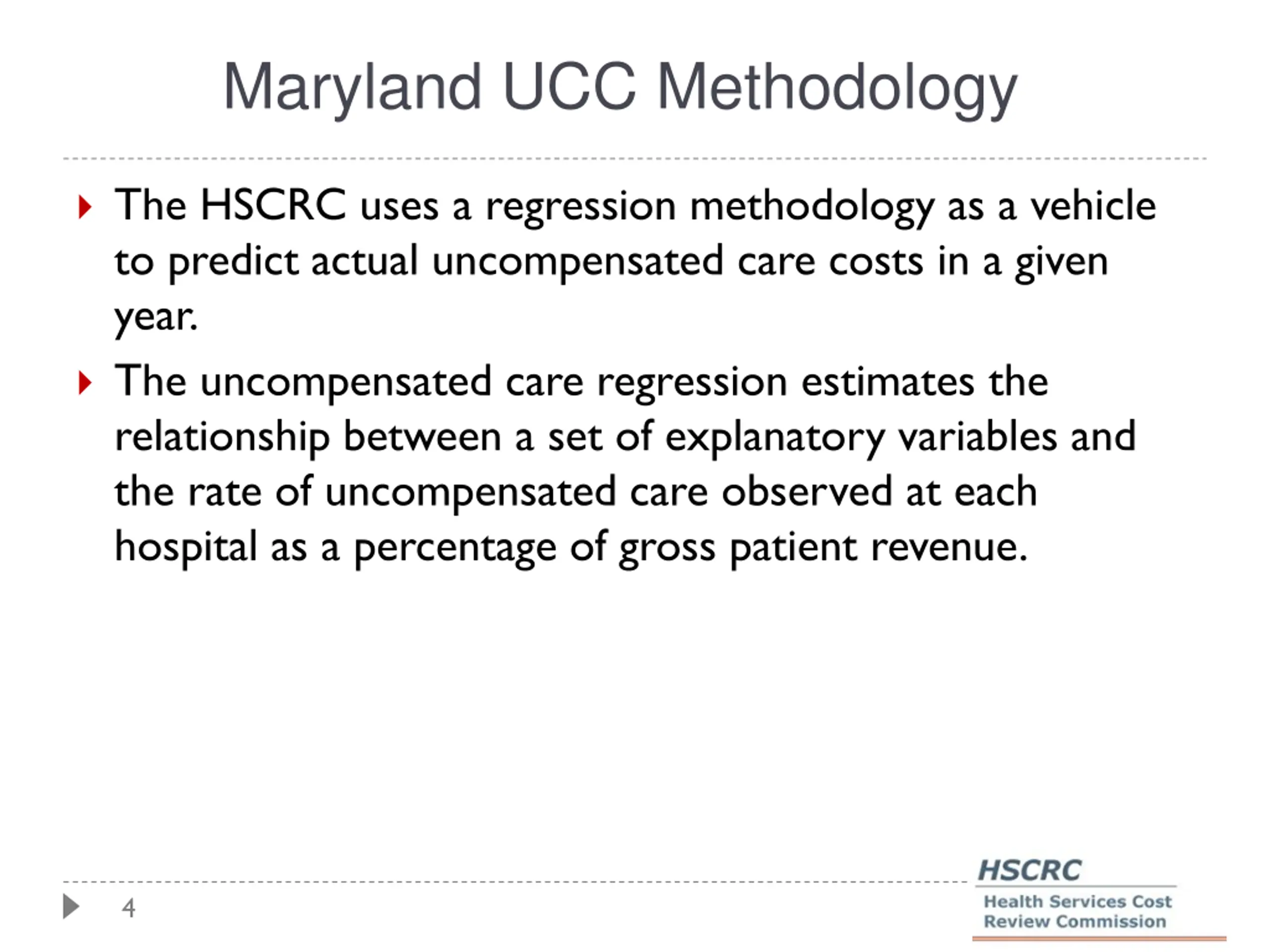Maryland UCC Methodology The HSCRC uses a regression methodology as a vehicle to predict actual uncompensated care costs in a given year. The uncompensated care regression estimates the relationship between a set of explanatory variables and the rate of uncompensated care observed at each hospital as a percentage of gross patient revenue. 4
