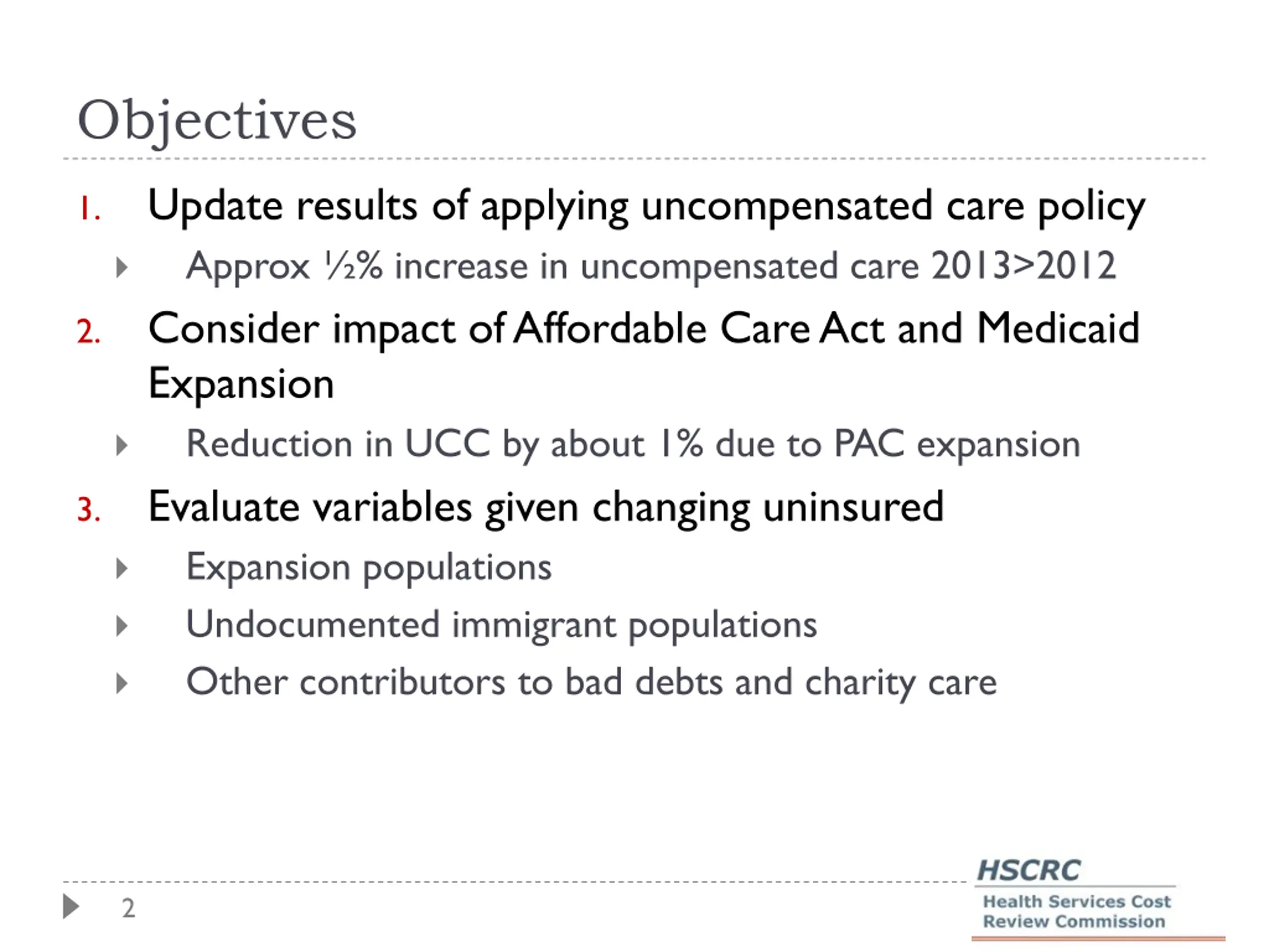 Objectives Update results of applying uncompensated care policy Approx % increase in uncompensated care 2013>2012 Consider impact of Affordable Care Act and Medicaid Expansion Reduction in UCC by about 1% due to PAC expansion Evaluate variables given changing uninsured Expansion populations Undocumented immigrant populations Other contributors to bad debts and charity care 1. 2. 3. 2