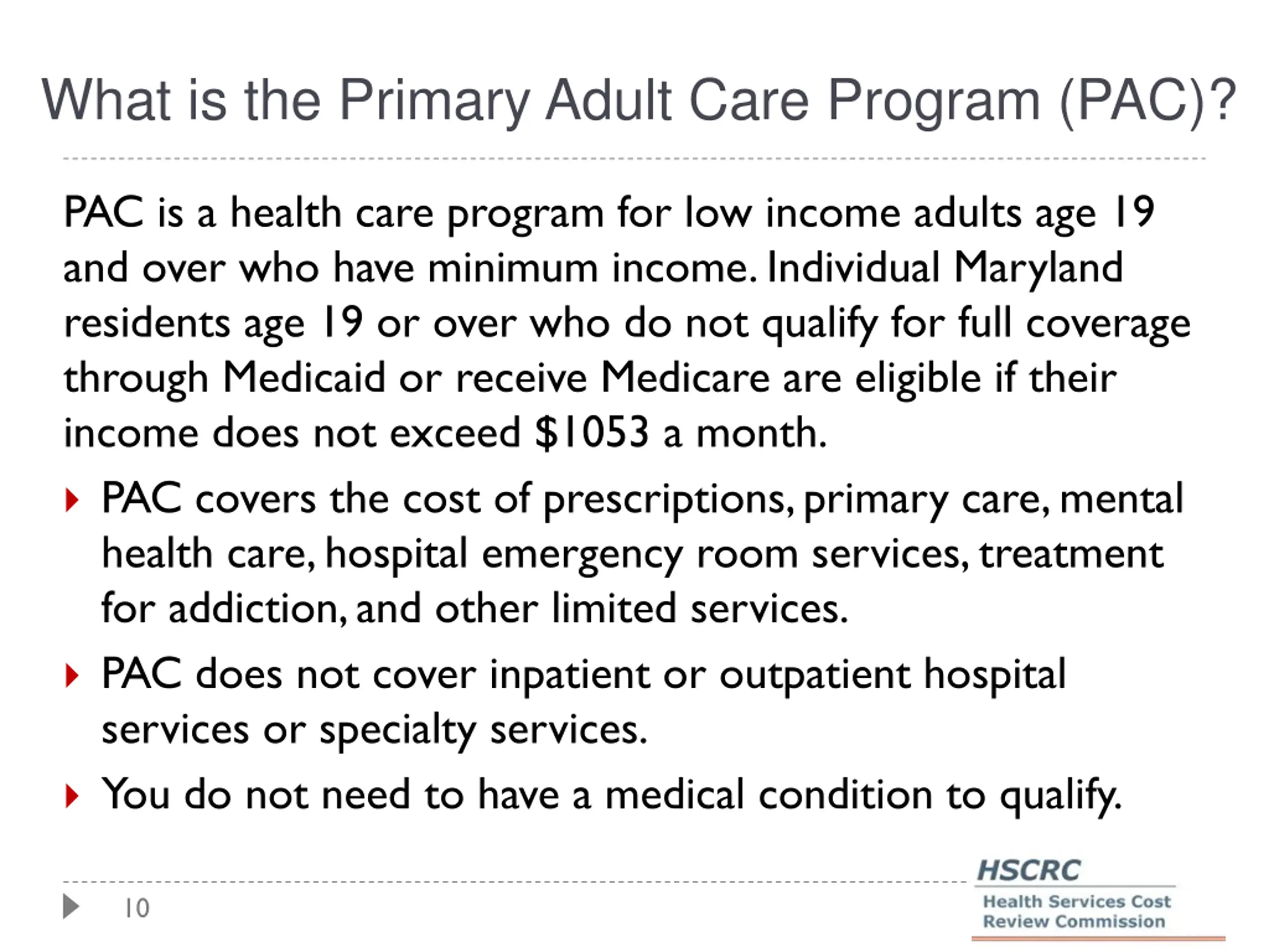 What is the Primary Adult Care Program (PAC)? PAC is a health care program for low income adults age 19 and over who have minimum income. Individual Maryland residents age 19 or over who do not qualify for full coverage through Medicaid or receive Medicare are eligible if their income does not exceed $1053 a month. PAC covers the cost of prescriptions, primary care, mental health care, hospital emergency room services, treatment for addiction, and other limited services. PAC does not cover inpatient or outpatient hospital services or specialty services. You do not need to have a medical condition to qualify. 10