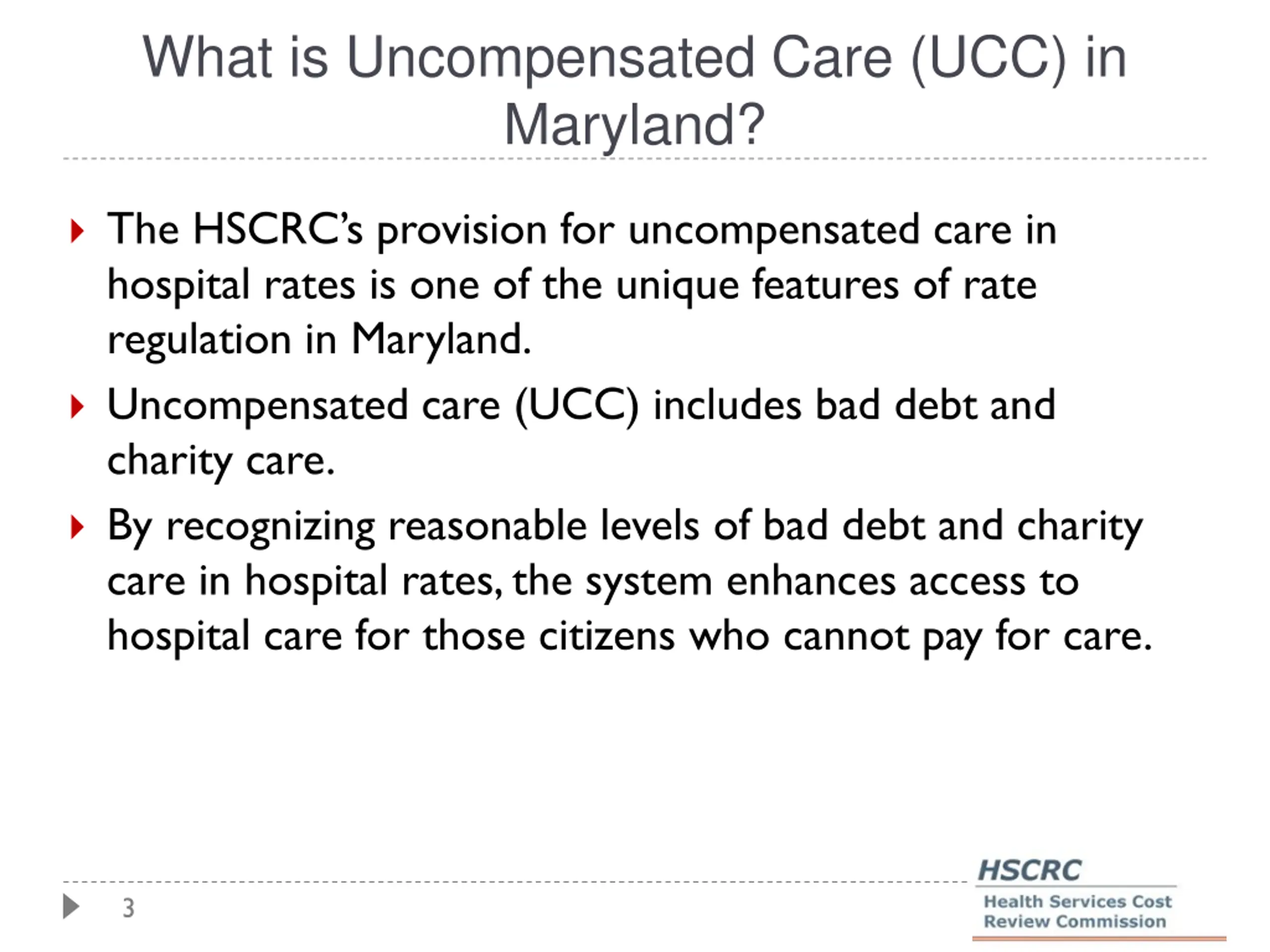 What is Uncompensated Care (UCC) in Maryland? The HSCRC s provision for uncompensated care in hospital rates is one of the unique features of rate regulation in Maryland. Uncompensated care (UCC) includes bad debt and charity care. By recognizing reasonable levels of bad debt and charity care in hospital rates, the system enhances access to hospital care for those citizens who cannot pay for care. 3